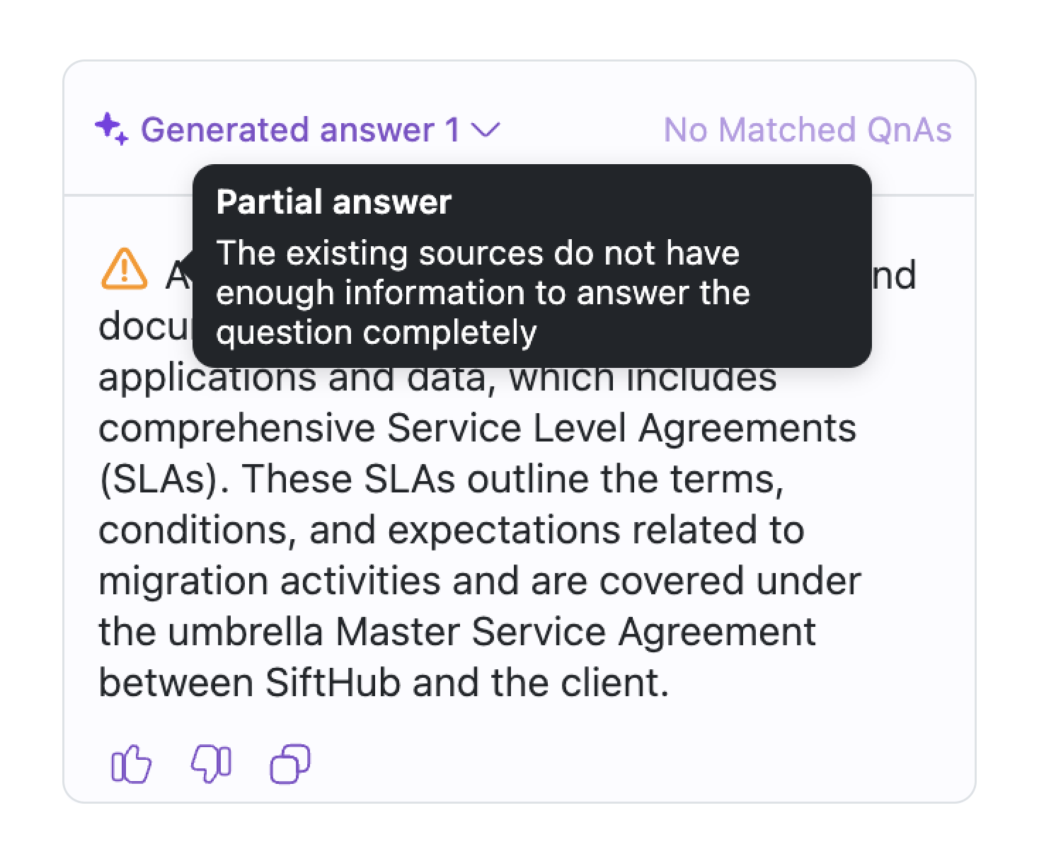 Partial answer: When the query can only be partially answered using connected knowledge sources, SiftHub indicates this with a flag in the response dialog in browser extension.