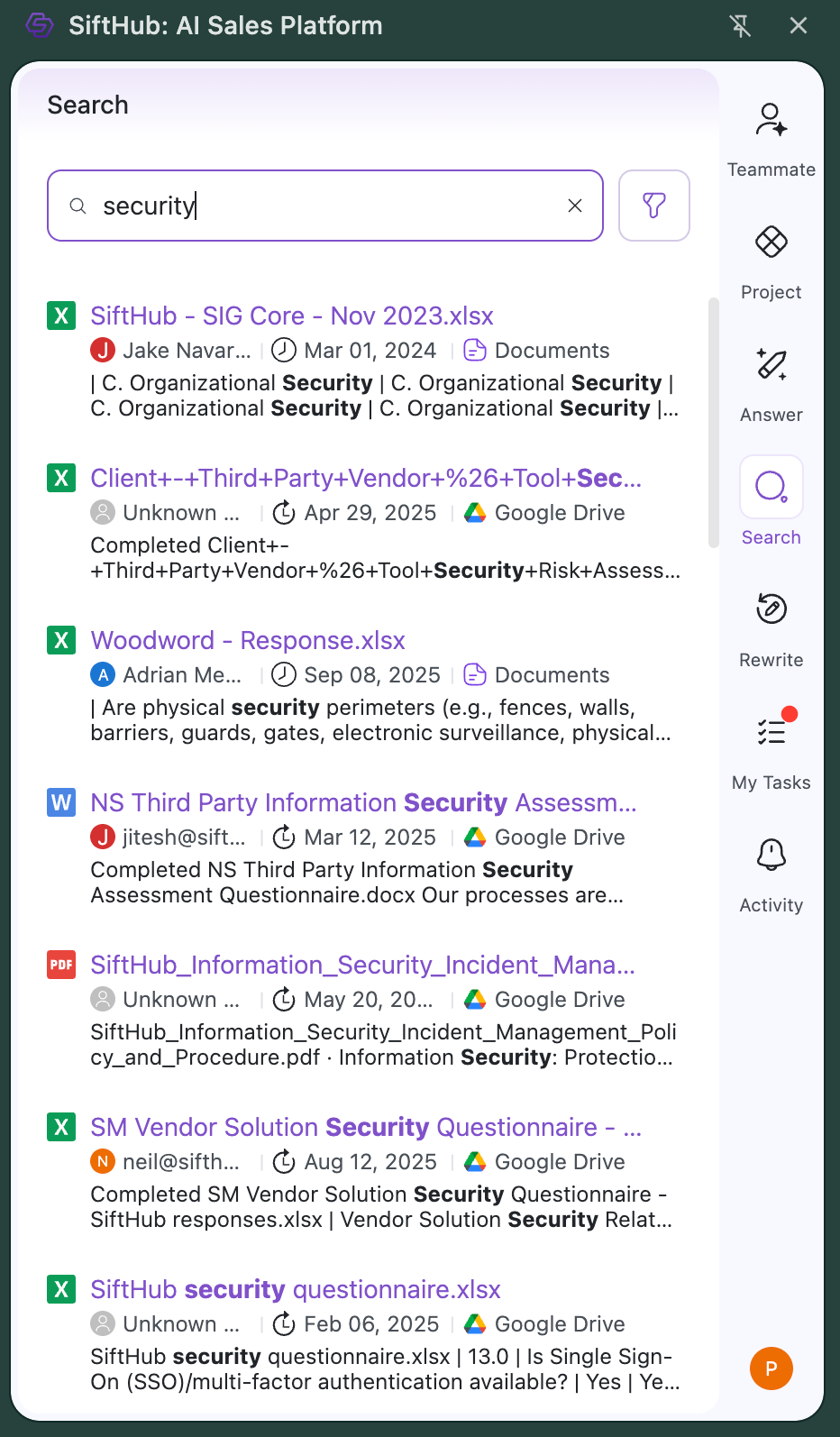 Search is available in the SiftHub Browser Extension, allowing you to find information without switching between different applications. Here's how to access it: