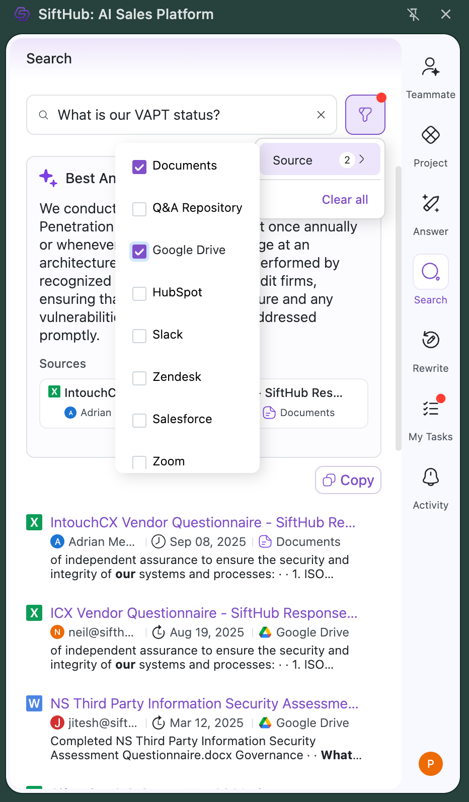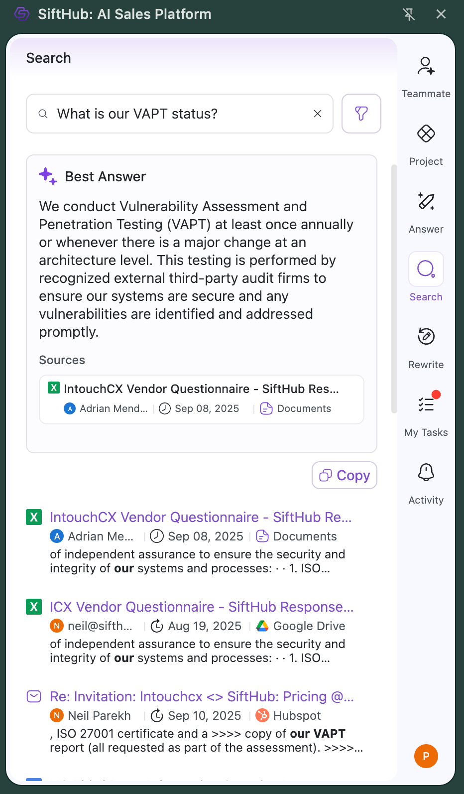 Sales teams often struggle to find the right information at the right time. Whether it's searching for a specific pricing document, looking up competitor information, or finding details about a past deal, the constant tab-switching and searching across multiple tools can be frustrating and time-consuming.