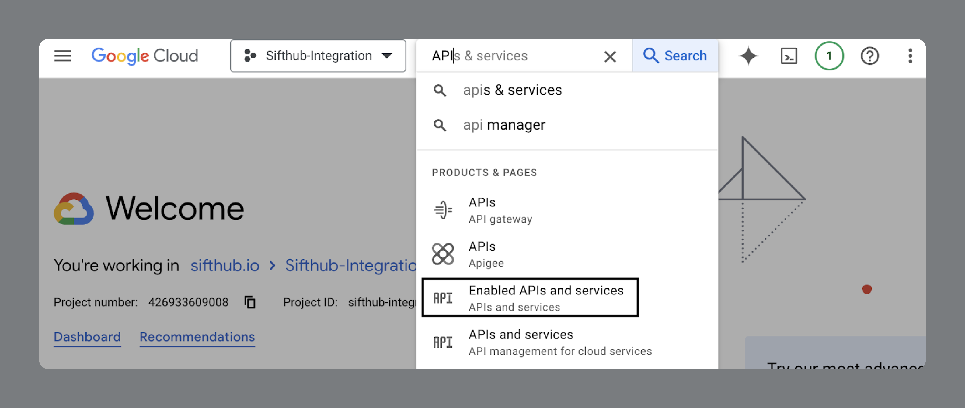 - Search for ‘Enabled APIs and Services’ in the search bar on top, next to the Project name. In the results dropdown, click on the Enabled APIs and services page in the PRODUCTS & PAGES category