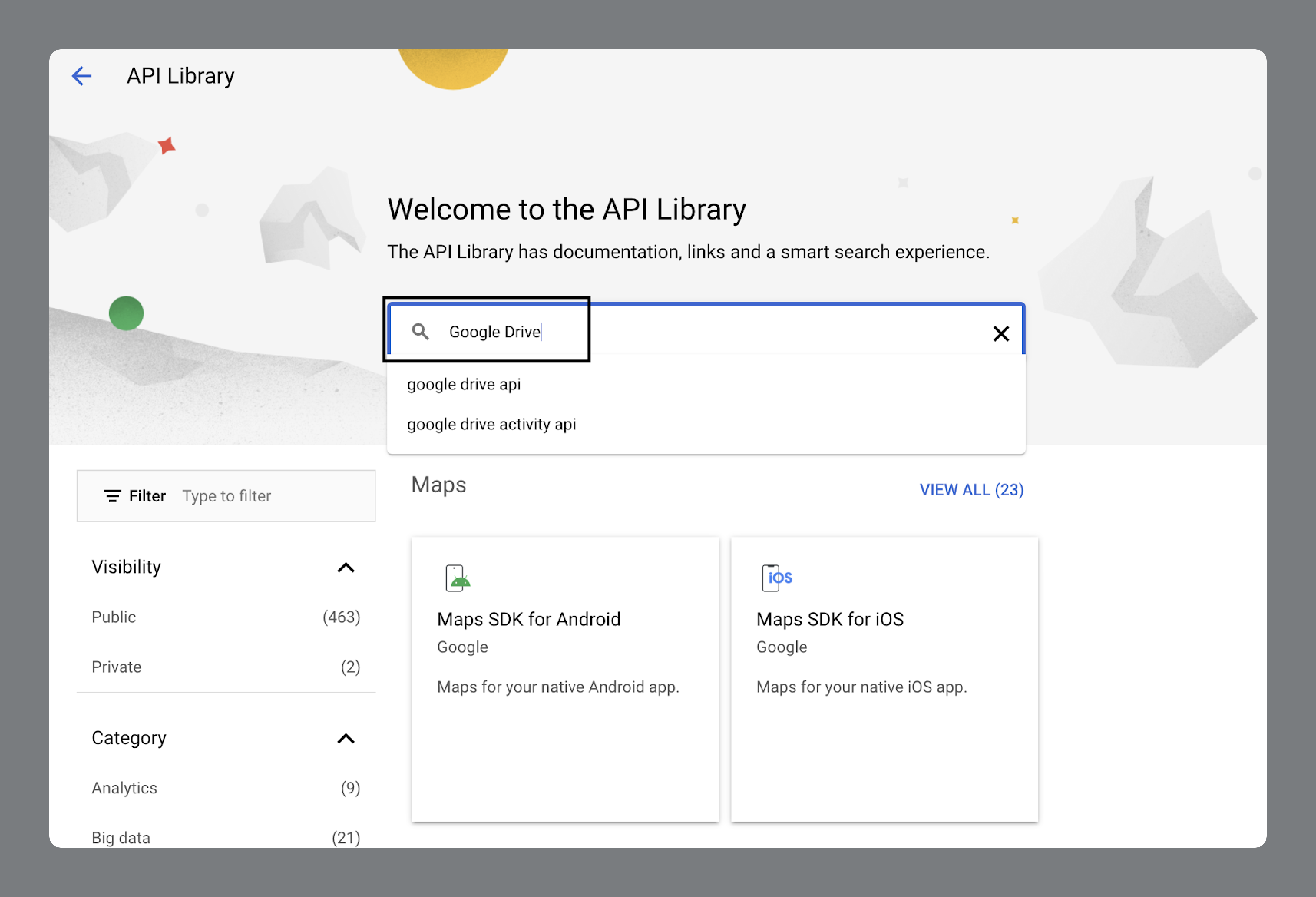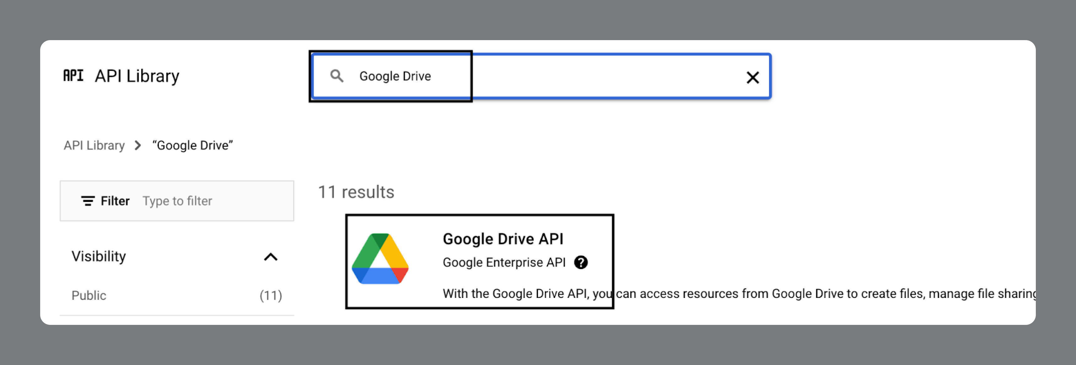 - Search for ‘Google Drive API’ in the API Library page and click Enter