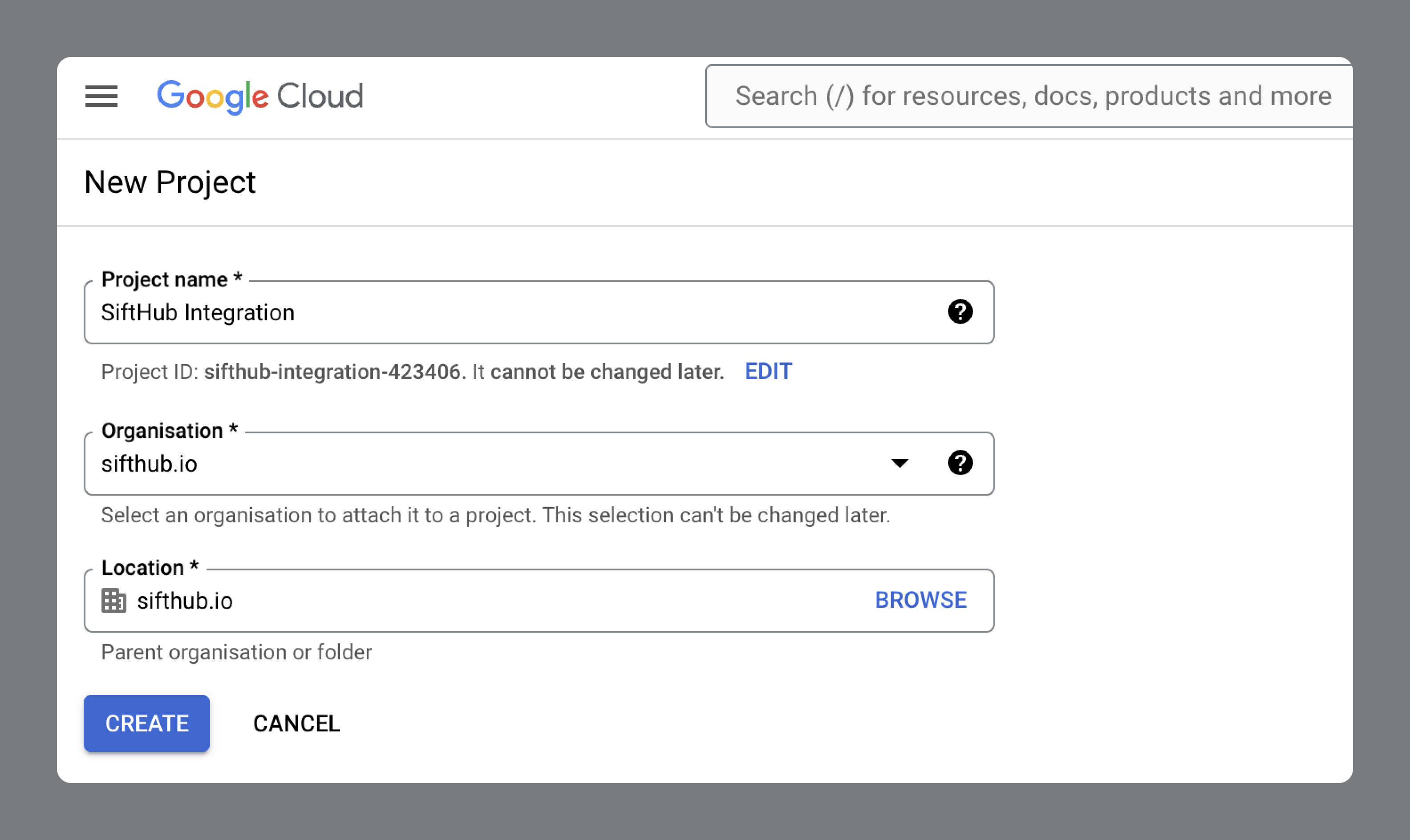 The service account will be created with the following email address: sifthub-integration@sifthub-integration.iam.gserviceaccount.com