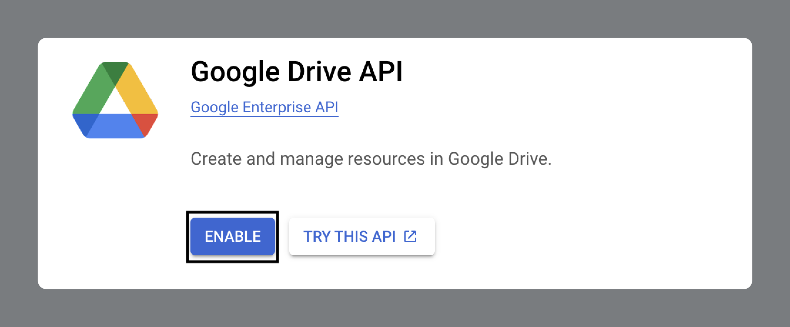 - On the Product Details page of the Google Drive API, Click on ENABLE
