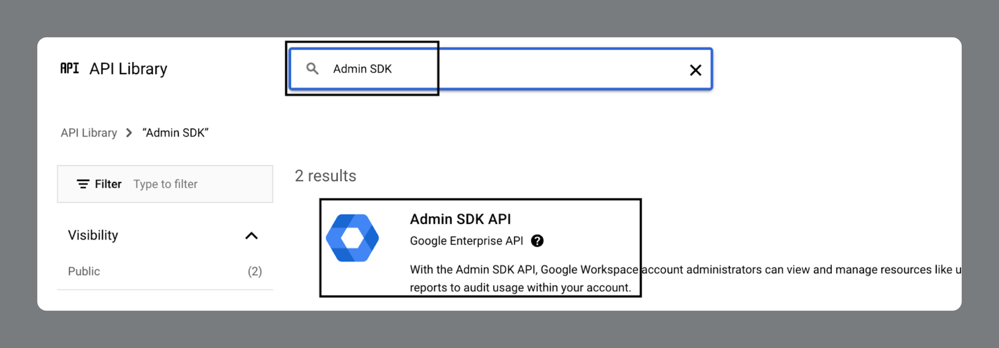 Repeat steps 2 to 6 above (Enable Google Drive API) for enabling Admin SDK API