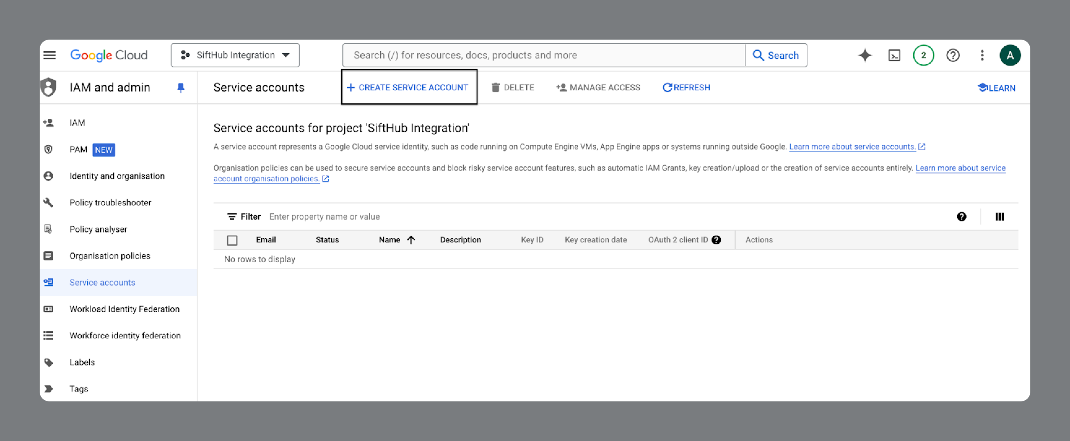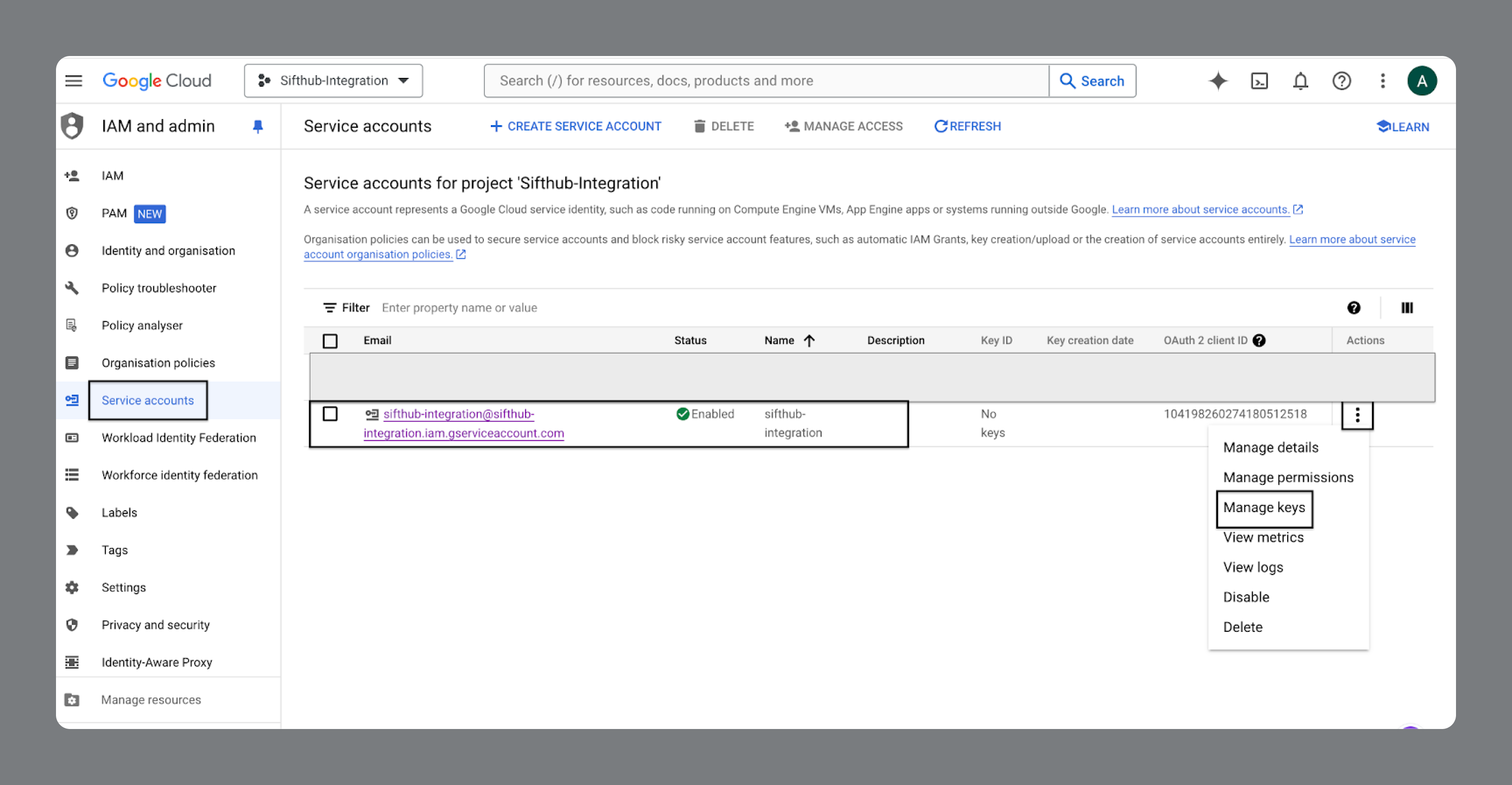 - On the Service account page, you will see the newly created service account under - Service accounts for project SiftHub Integration