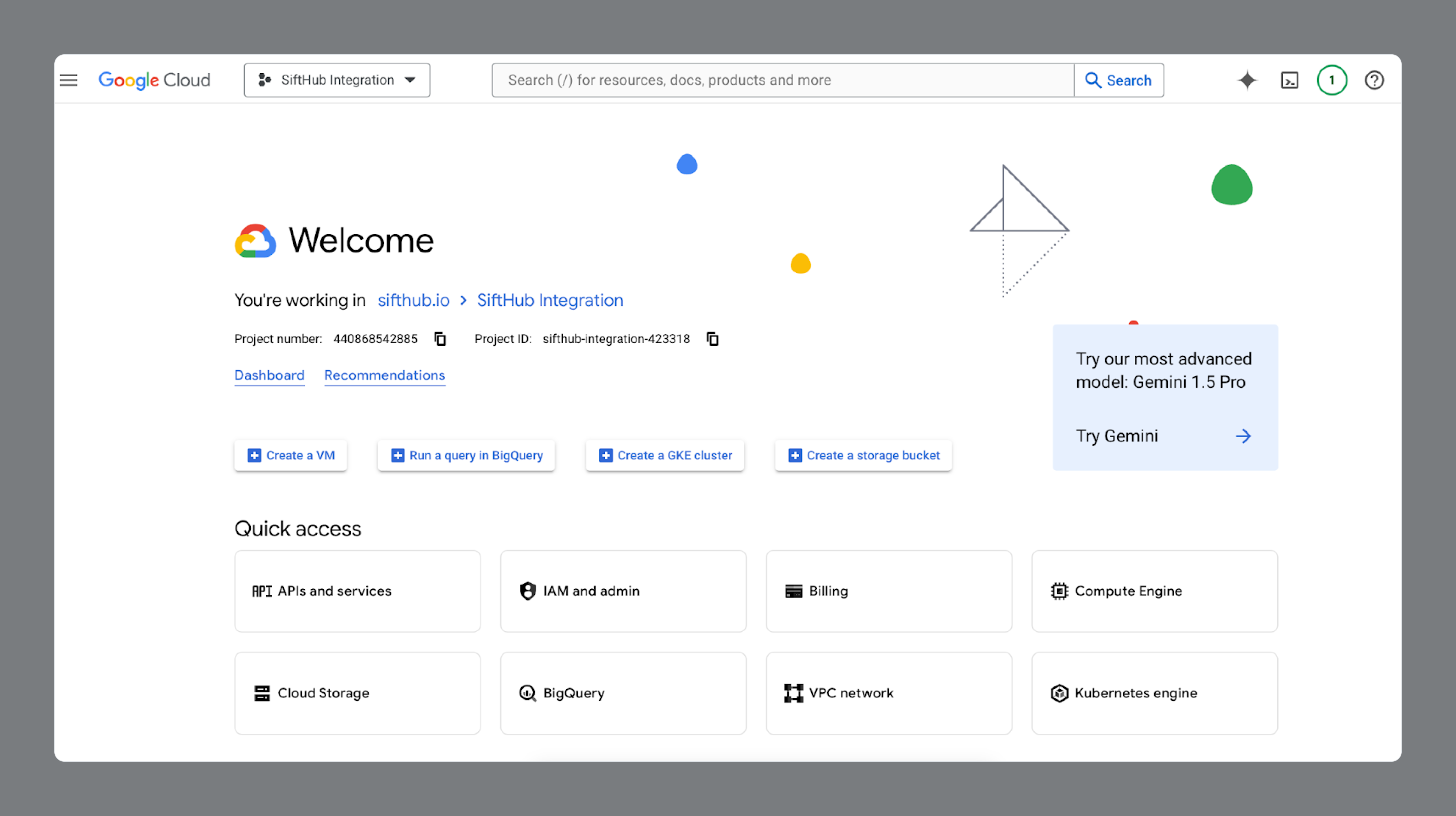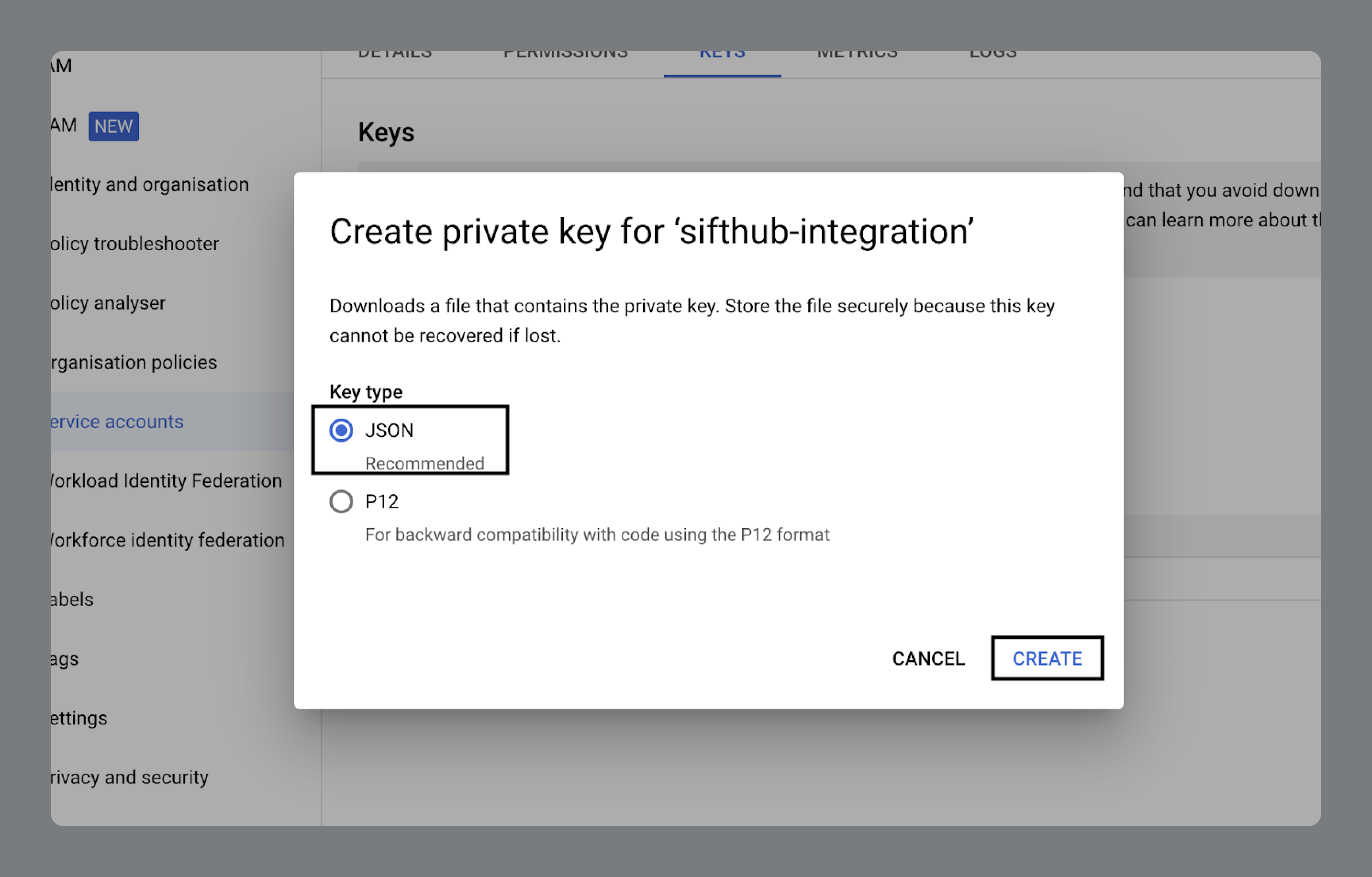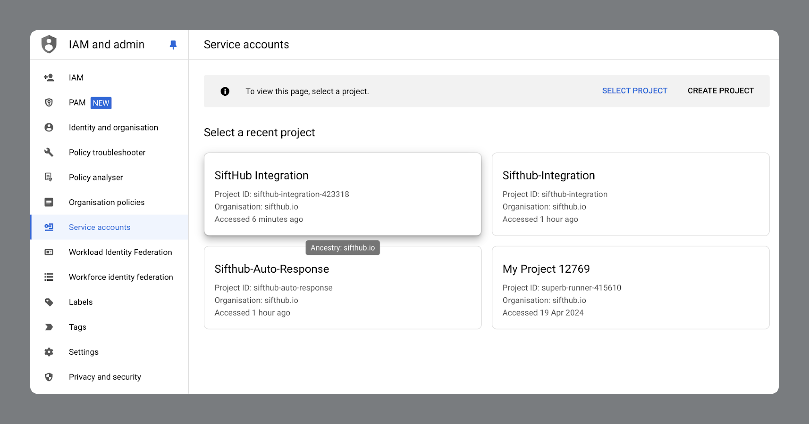 - On the Service accounts page, under Select a recent project, click on SiftHub Integration
