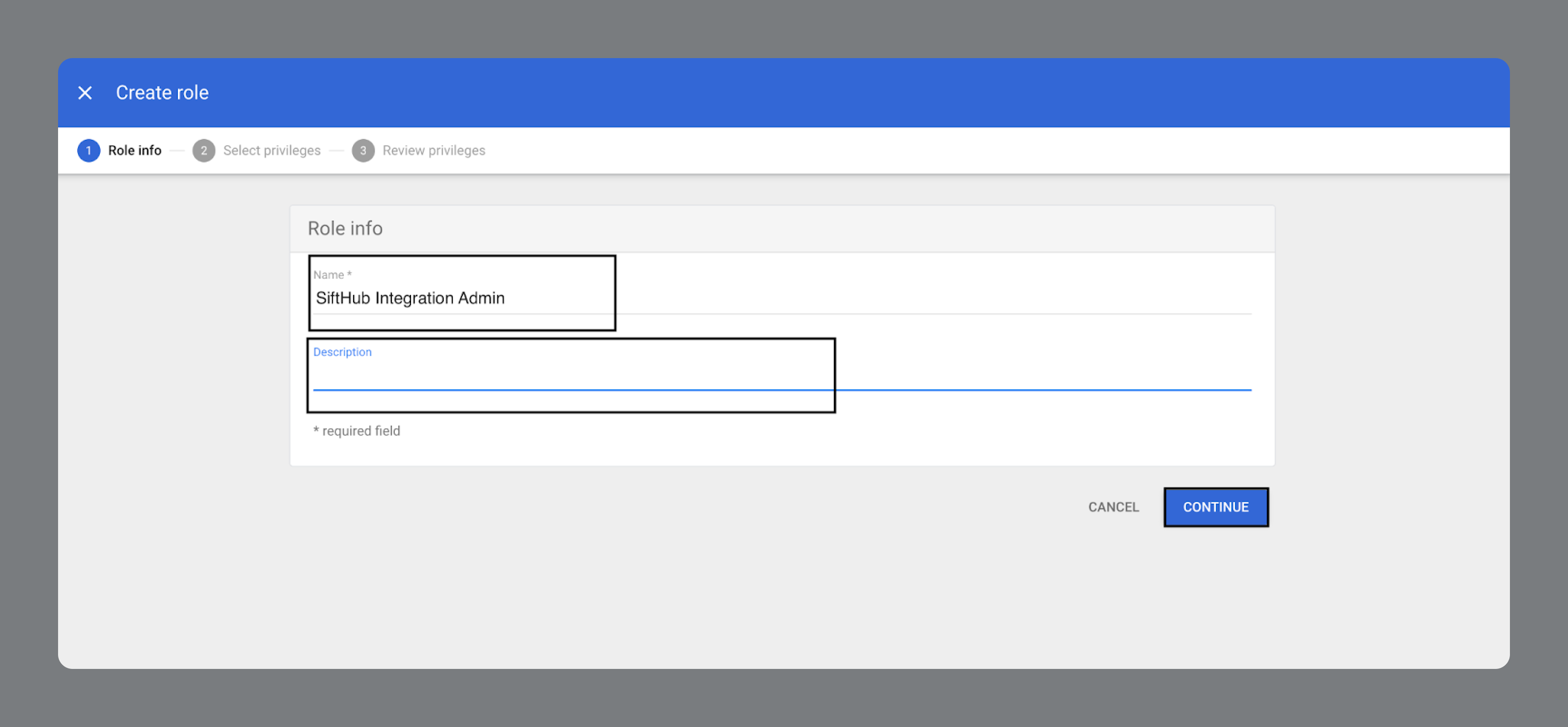 - In the Role info tab, enter the Name - ‘SiftHub Integration Admin’. Description can be left empty.