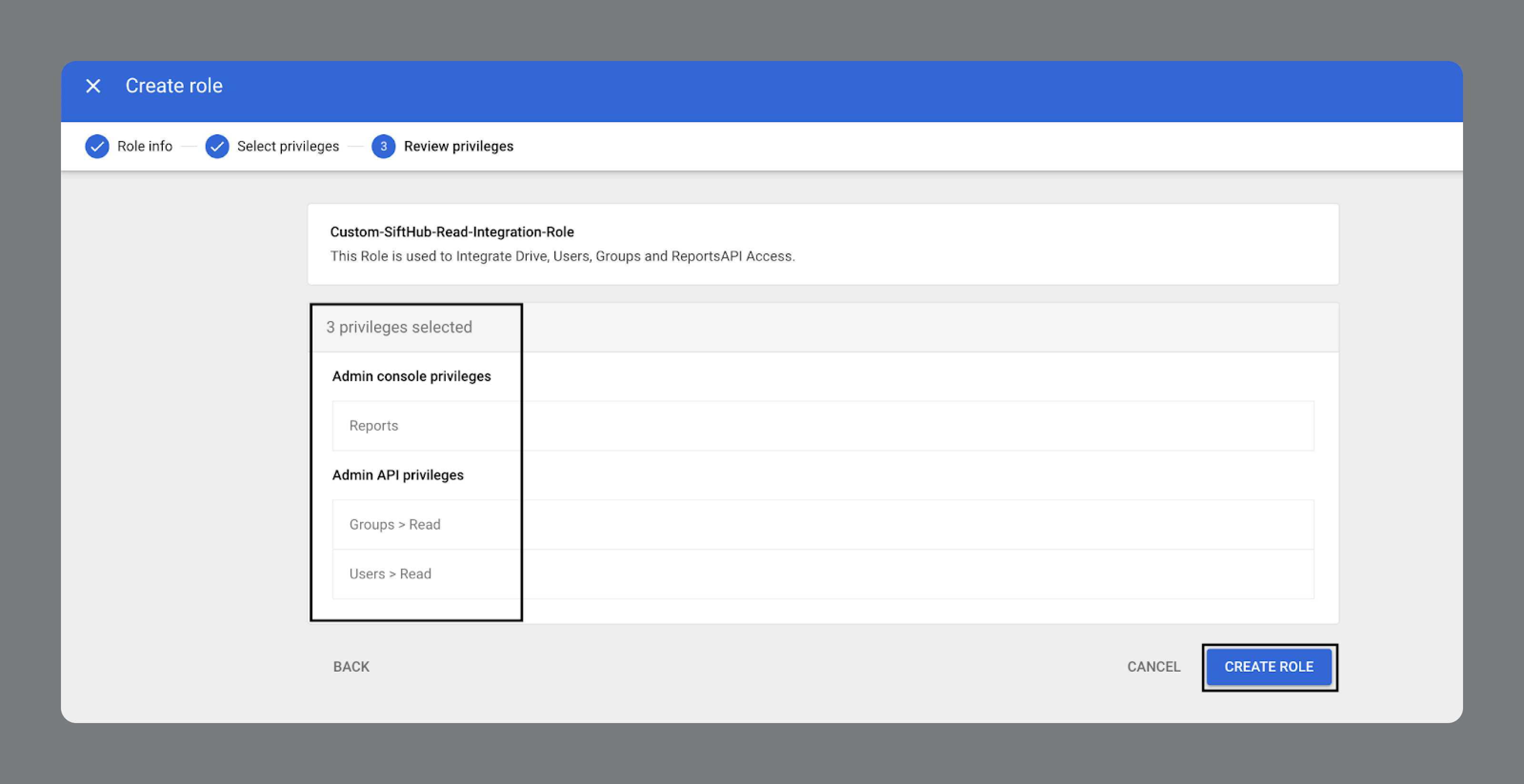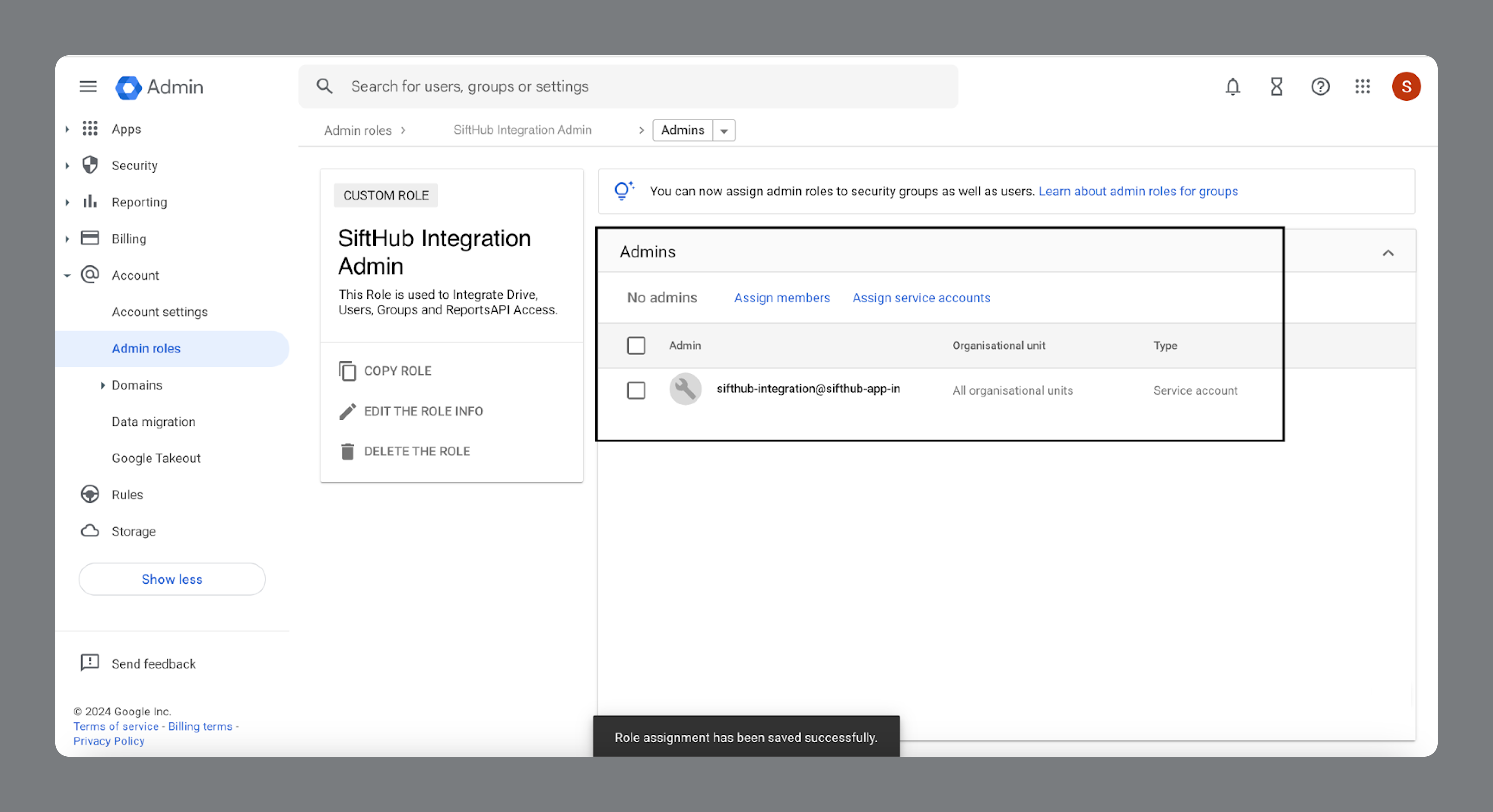 The custom admin Role needs to be assigned to the Service Account created in Step 3, for SiftHub Platform to be able to retrieve read only information about users, groups and activity reports.