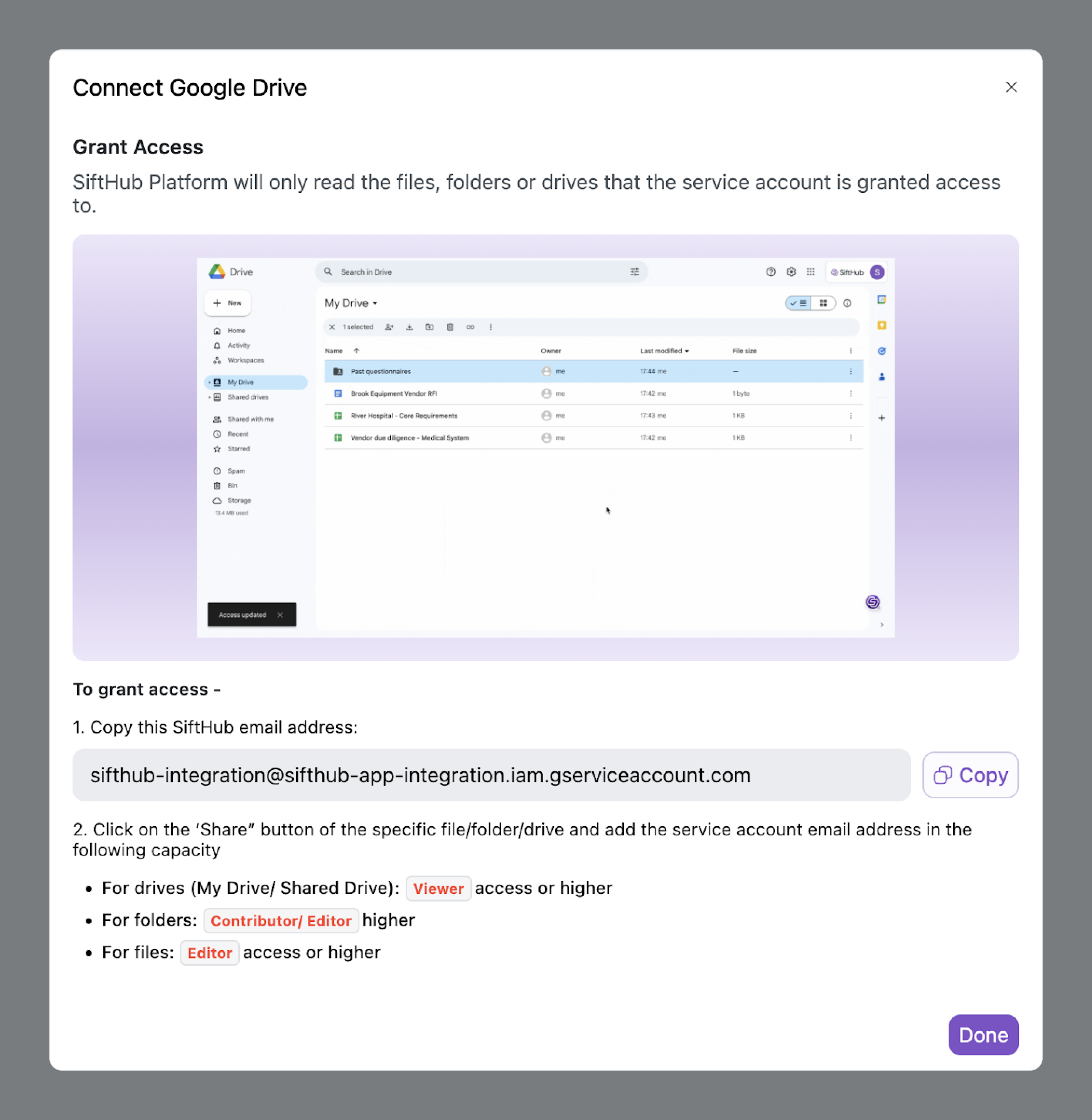 Only the files, folders or shared drives that the Service Account is added to, will be indexed and used by SiftHub Platform for Search and Answer Generation. SiftHub Platform will not have access to any information that is not shared with the Service Account.