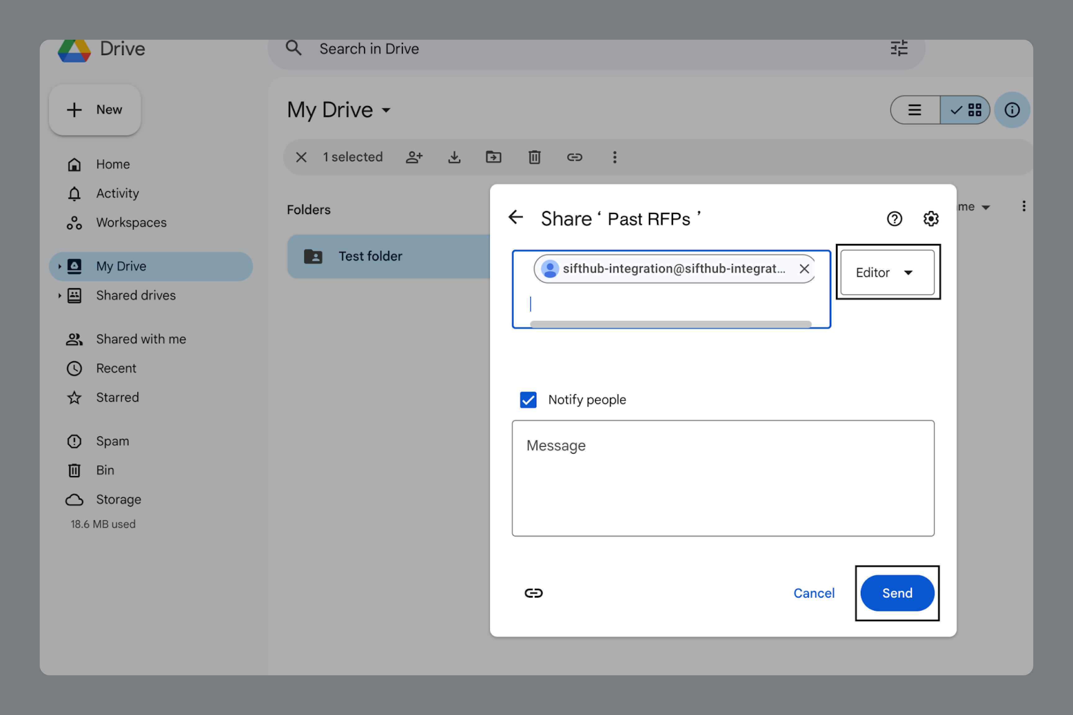 - To allow SiftHub Platform access to a folder or file within My Drive, make sure you add the service account with an ‘Editor’ access or more