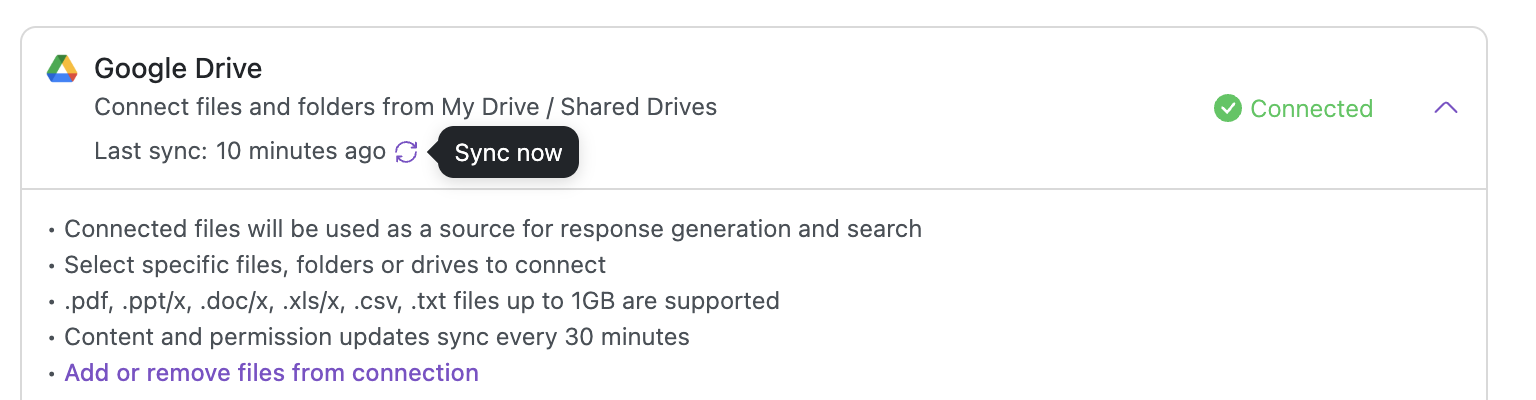 Newly added / modified files and permission updates are automatically synced every 30 minutes. When the service account is added to a new file or folder, you may have to wait for up to 30 minutes for the auto-sync to happen and the file contents to start showing up for response generation and search. Alternatively, for files/folders that you may want to sync and index more urgently, you can simply trigger a manual sync via the Connectors Page > Google Drive Connector, and the updated files will be available for use within a couple of minutes.