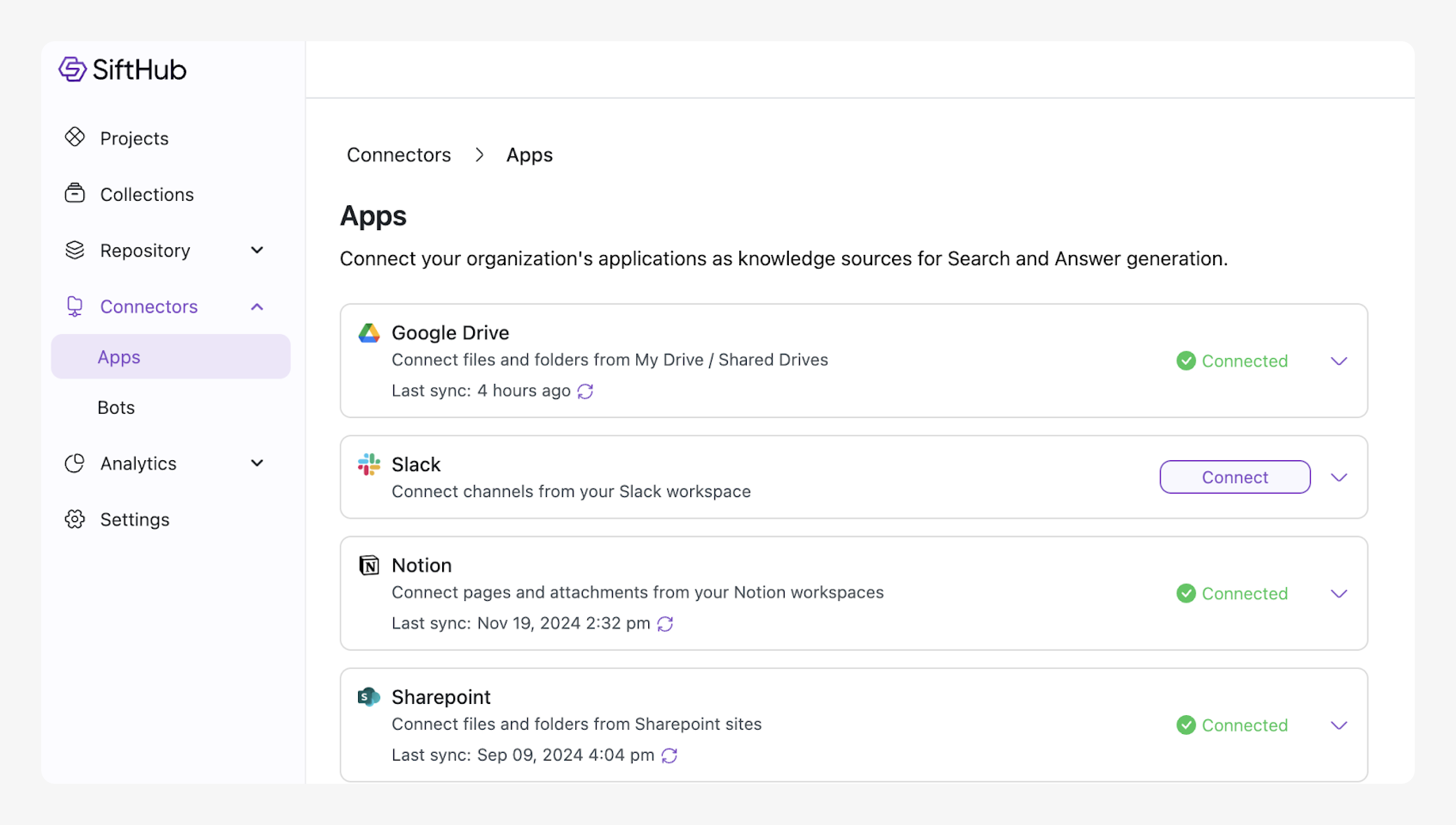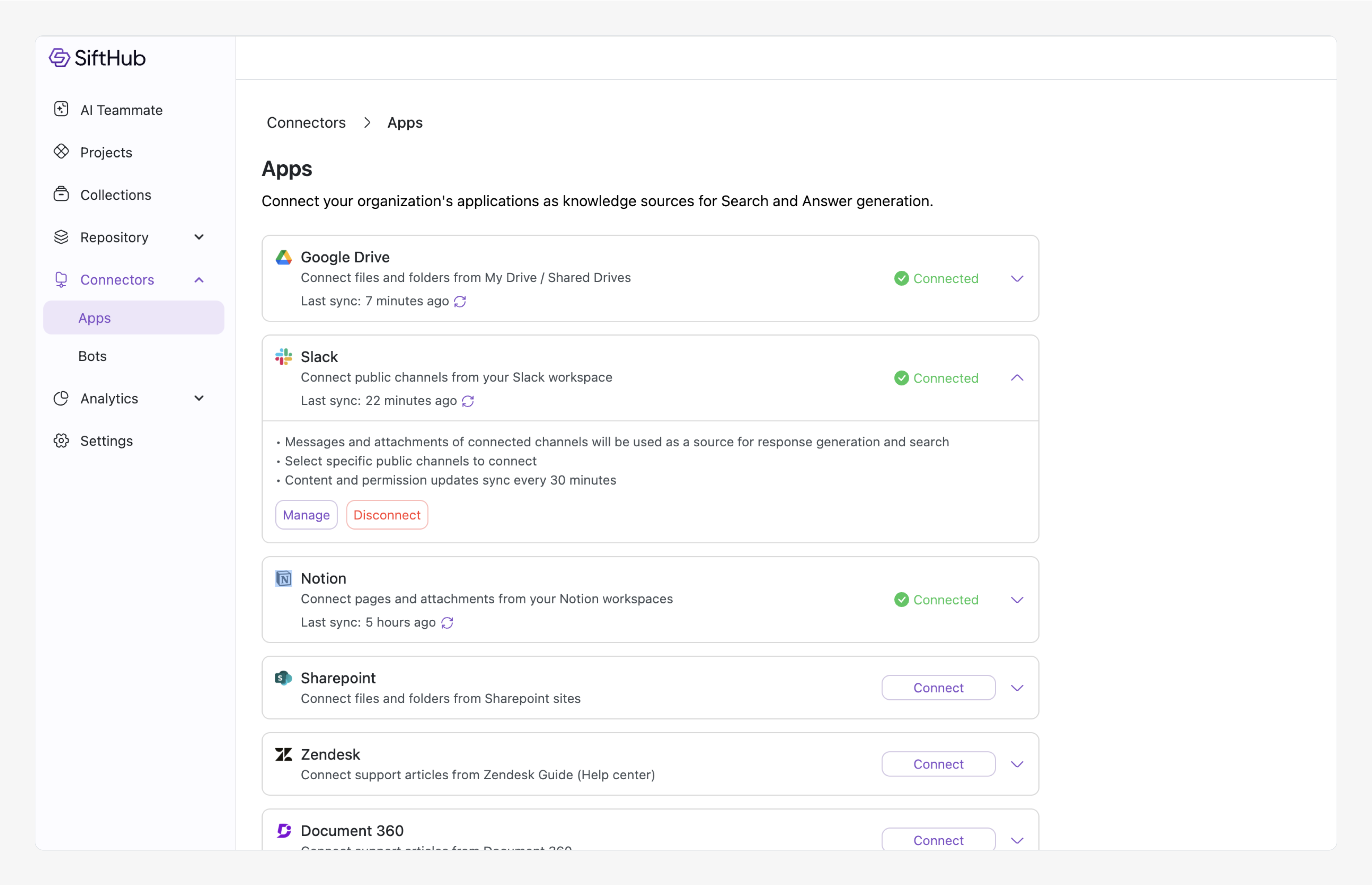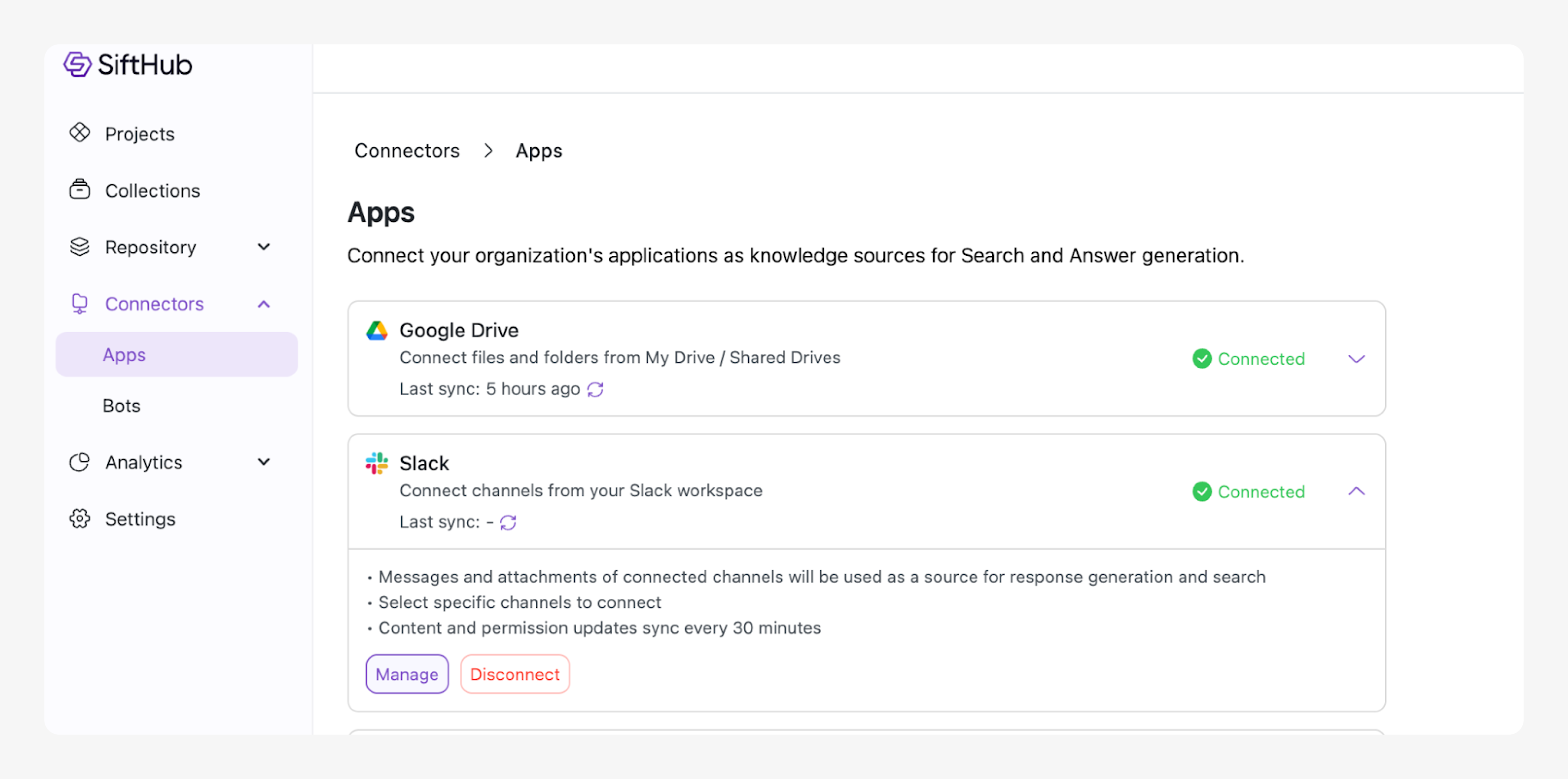 - In the SiftHub Connectors > Apps page, click on Slack -> Manage