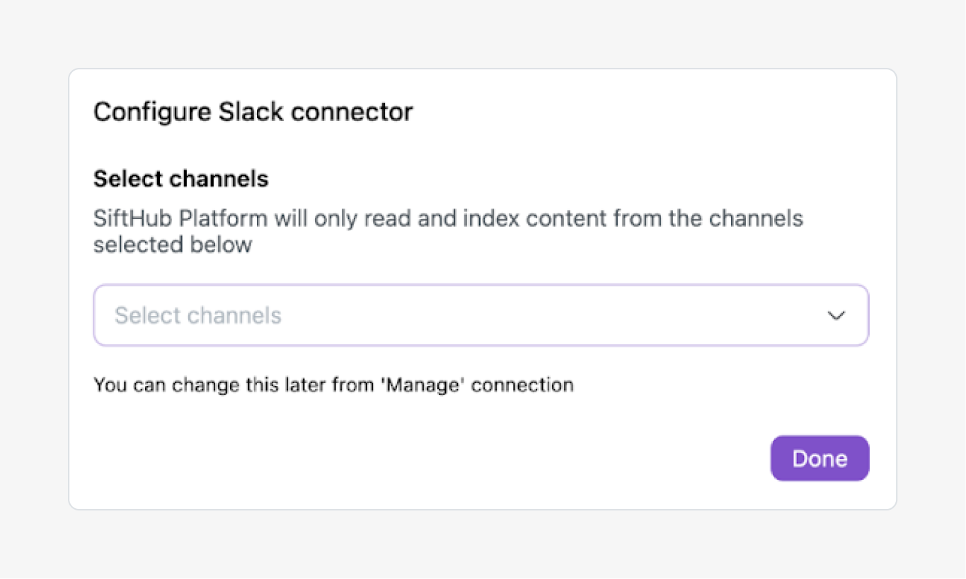 - You can select public channels from the dropdown that you want SiftHub to index. Once selected, click Done. You can manage the channels later as well