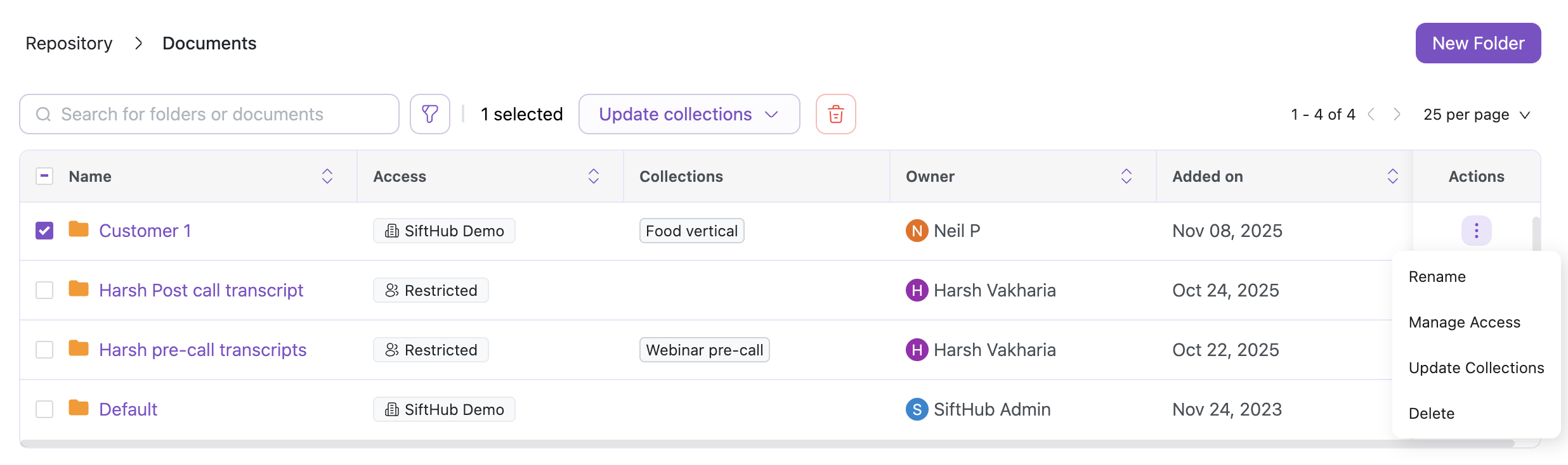 On the Documents home page, you’ll see a list of folders along with key details such as Access, Collections, Owner, and Added on.