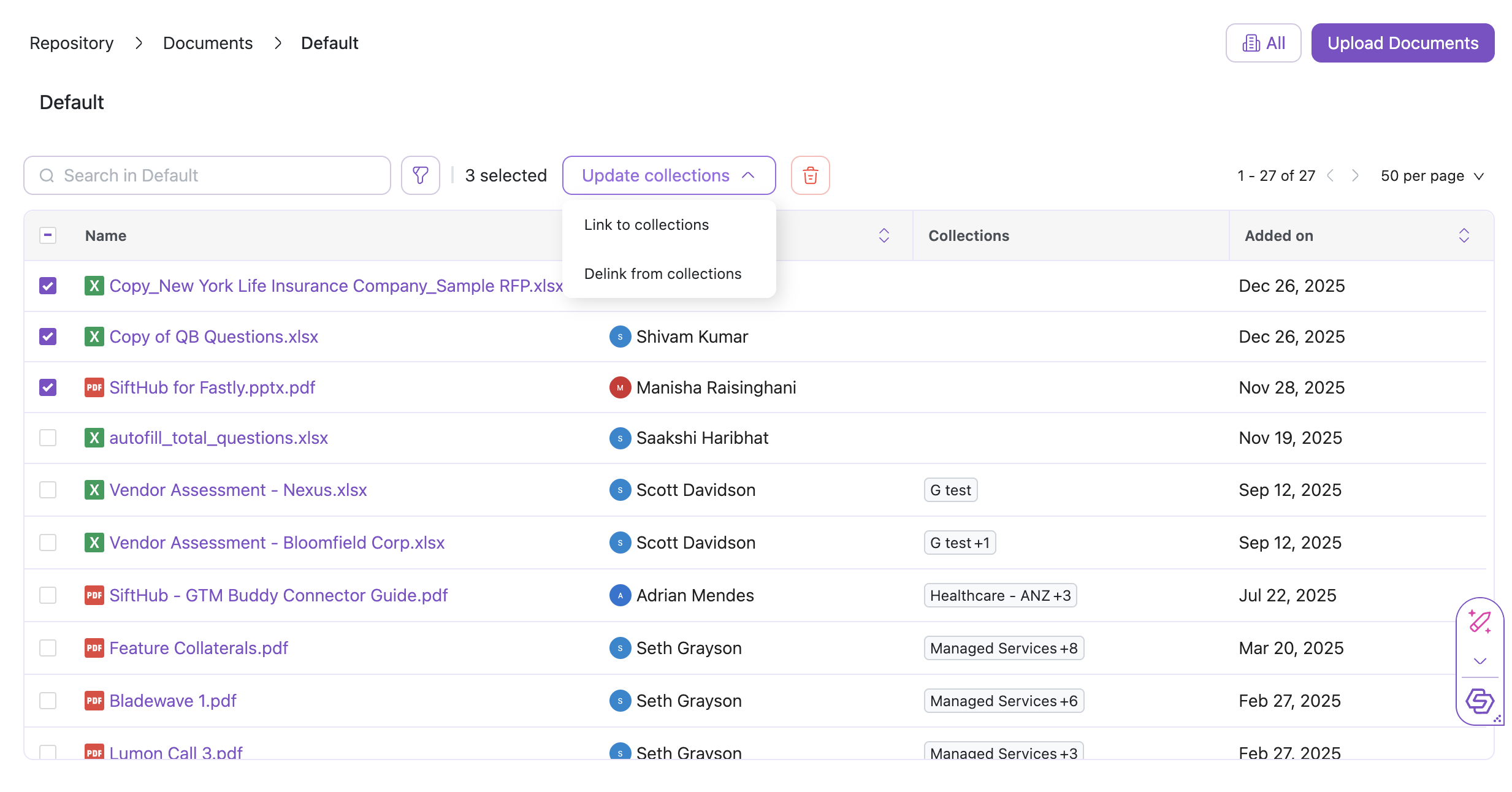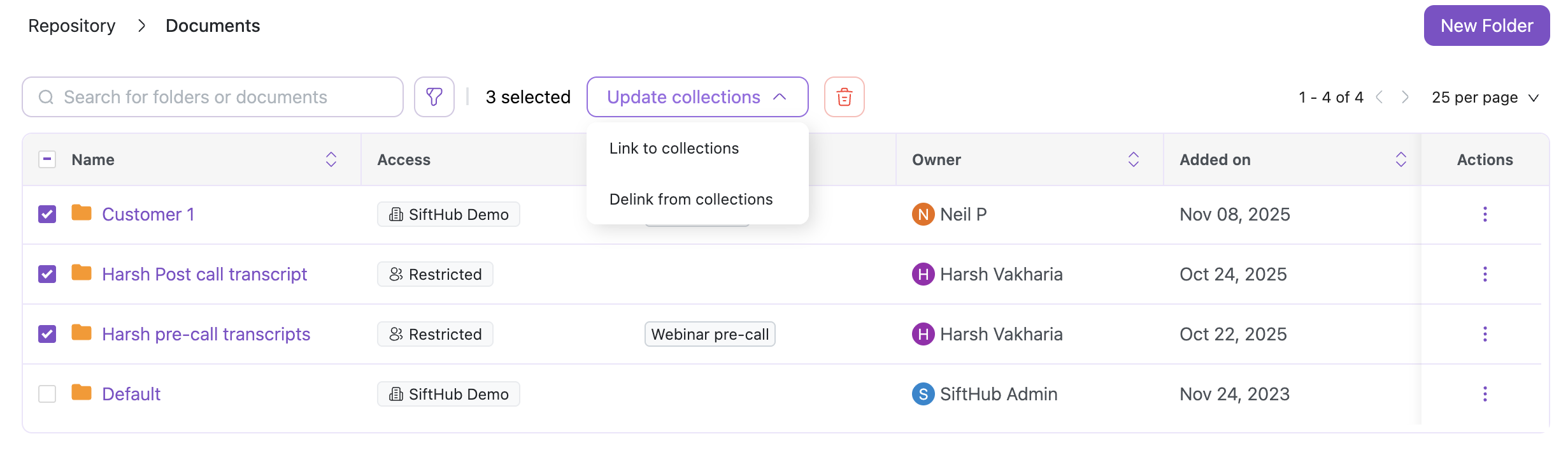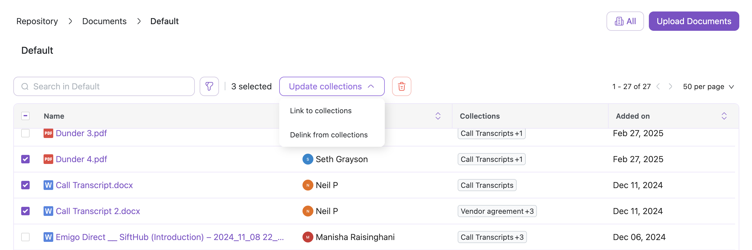 - Delink from Collections: To delink selected documents from Collections they're currently linked to.