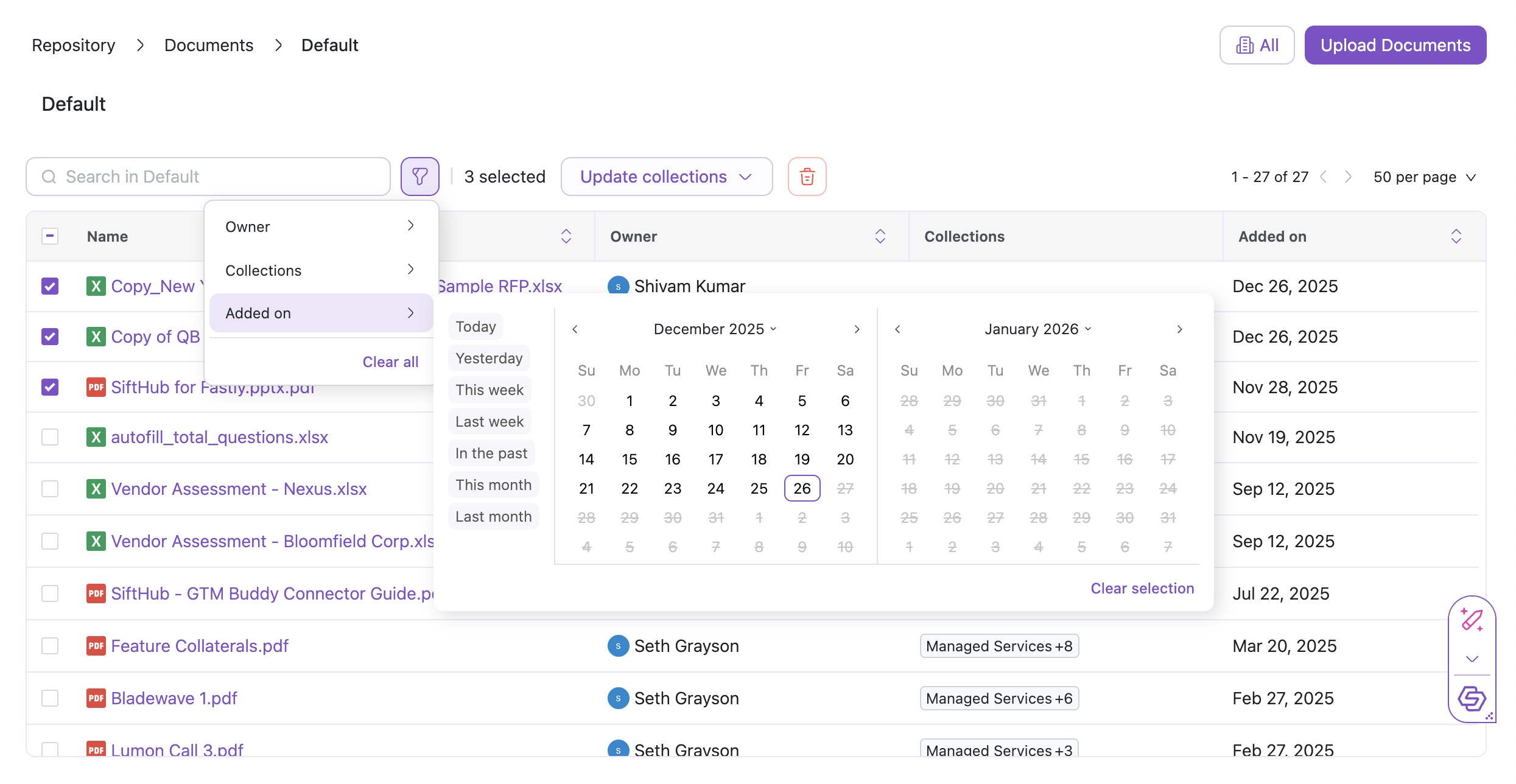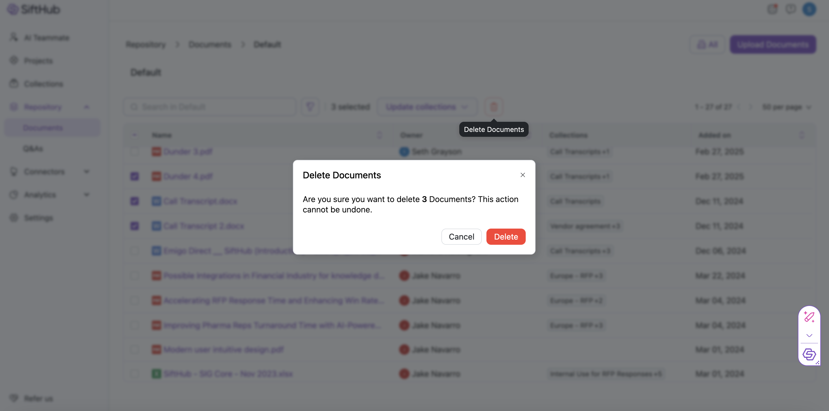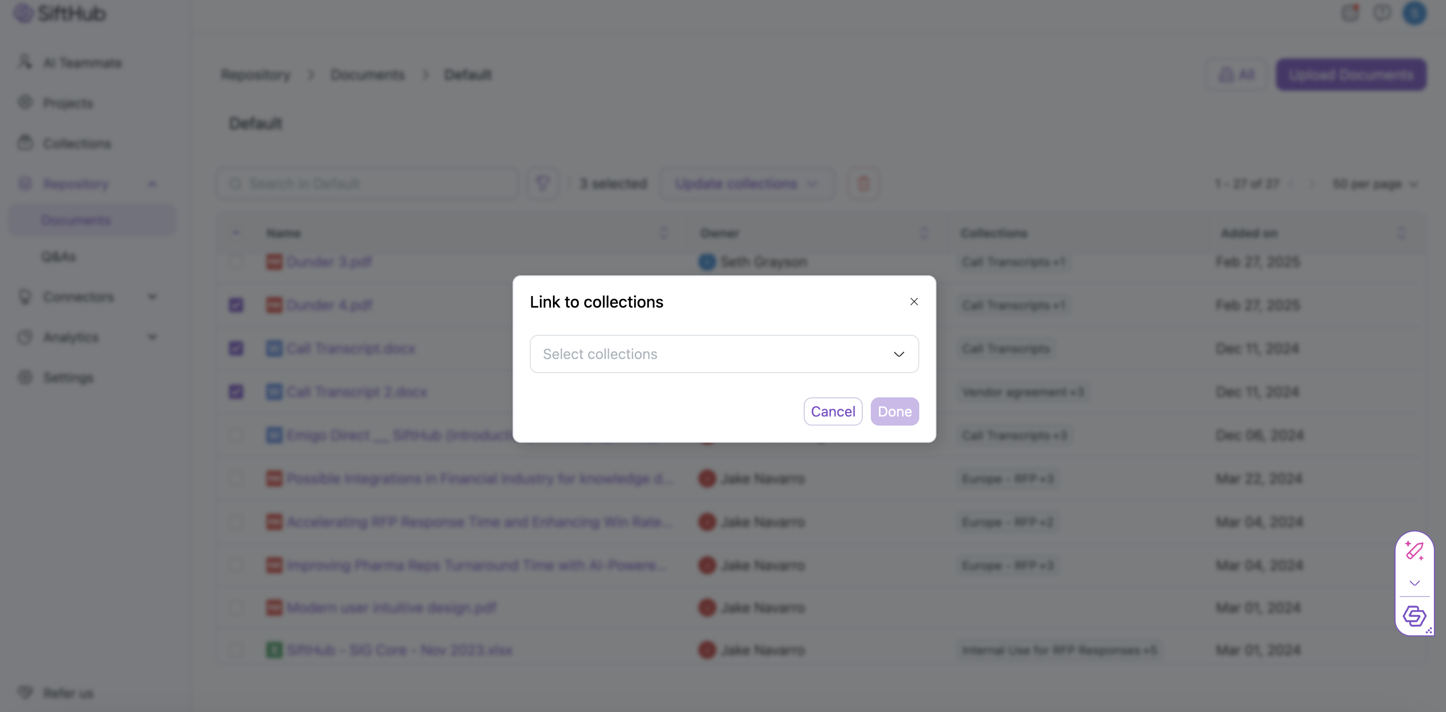 - Delink from Collections: To delink selected documents from Collections they're currently linked to.