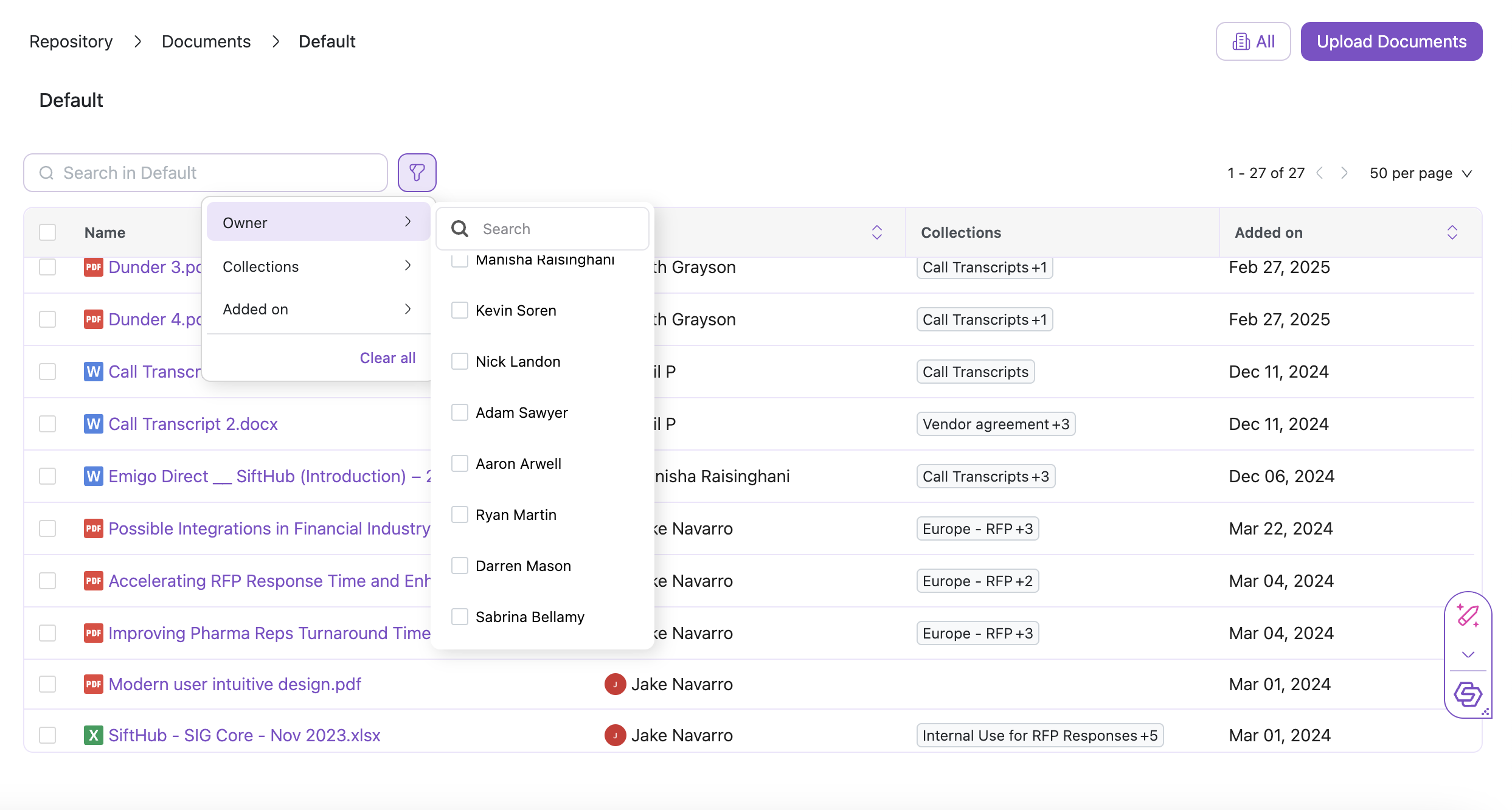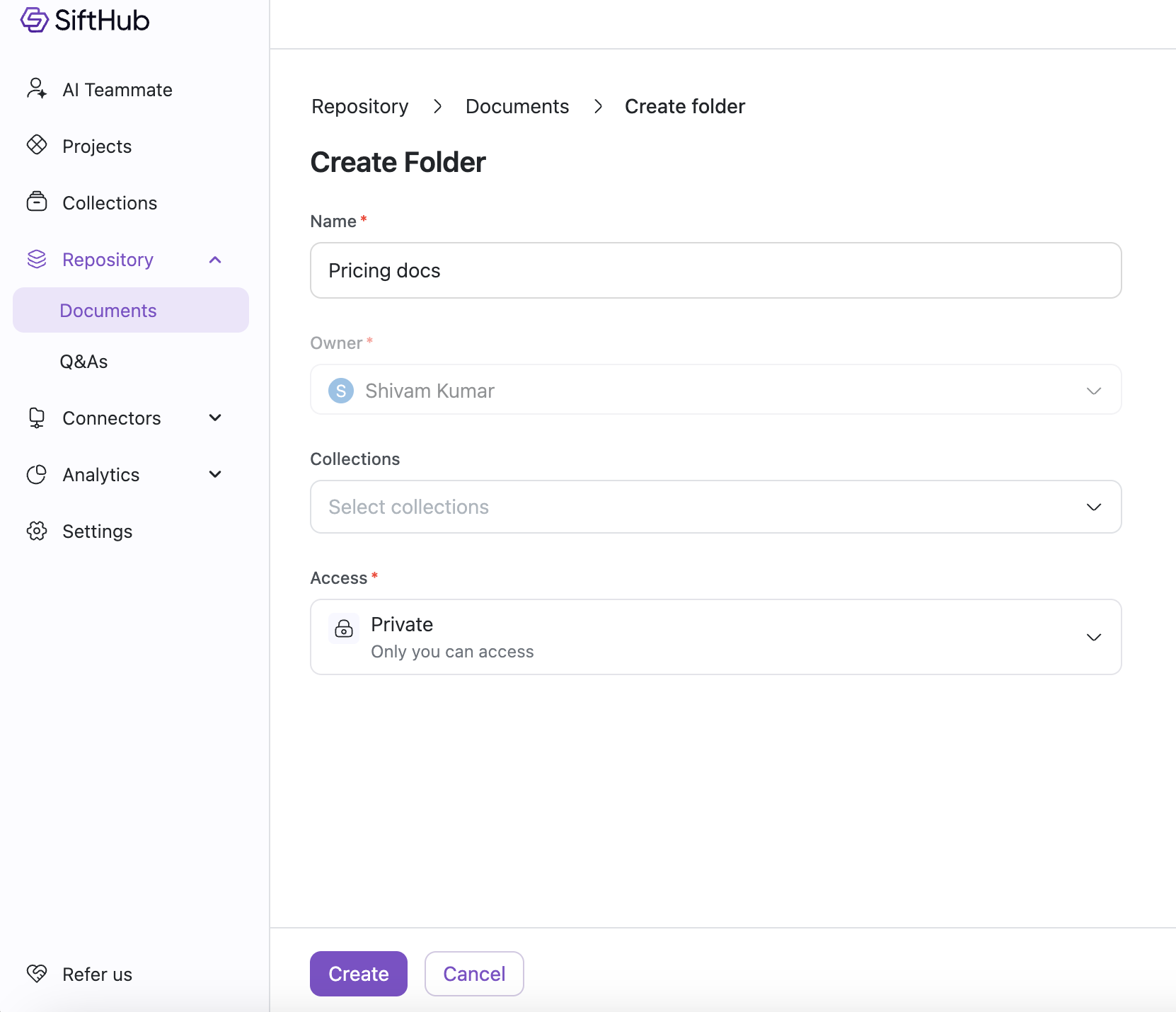 The Documents section in the SiftHub Web App provides comprehensive tools for organizing and managing your uploaded files. You can create and manage folders, upload documents into folders, search for specific documents, apply filters, perform bulk updates, and manage folder access.