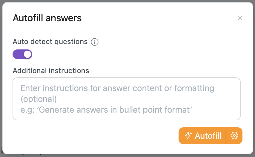 - Add instruction prompts to customize the formatting and content used for each Autofilled answer. These are similar to the Instruction Prompts used in 'Generate Answer' from the Browser Extension, except that they will apply to each answer that is autofilled in the activity.