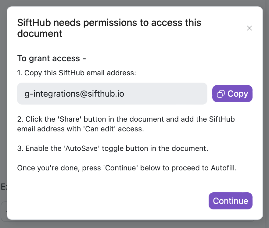 Therefore, when an Autofill is triggered, a pre-modal is shown with steps to complete a one-time setup and provide the SiftHub email address with the required access.