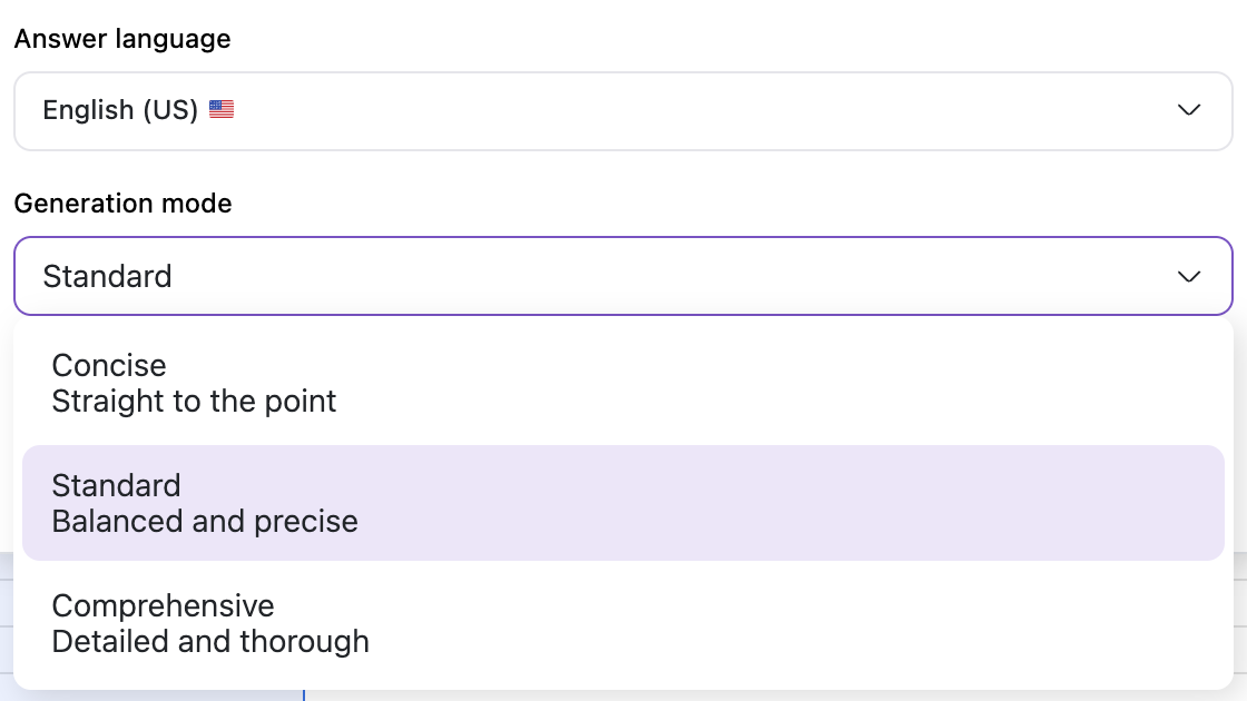 Autofill settings are similar to Generate answer settings which allow the user to set the language of the Autofill run, or set the Generation Mode as: