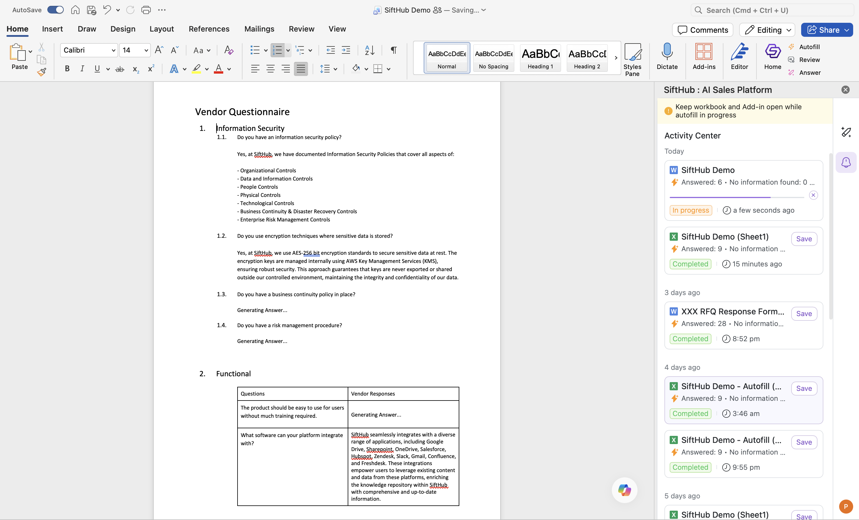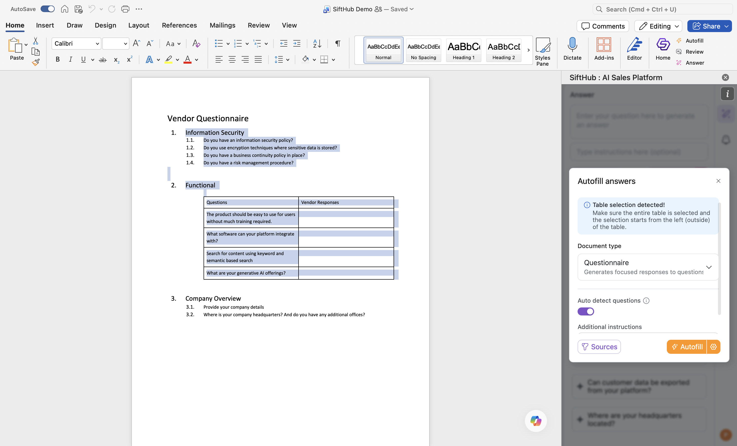 SiftHub's Autofill for MS Word cuts that time down to minutes by letting you generate answers for multiple questions simultaneously. Simply select all relevant questions, click Autofill, and watch as SiftHub automatically populates intelligent, contextual responses across your entire document in seconds. What used to take days can now be completed in a single batch operation.