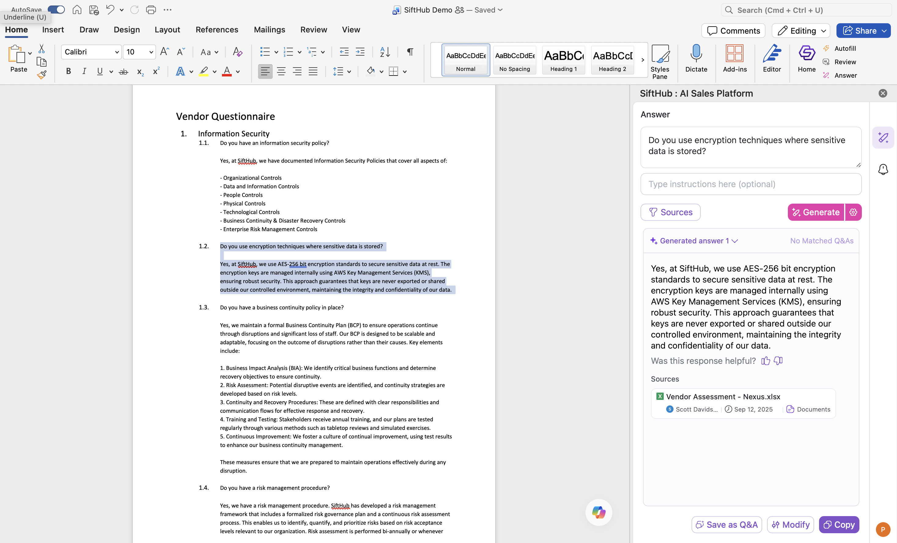 As the answers are being Autofilled in the document, you can start reviewing them in the Copilot -> Answer tab of the MS Add-in. From here, you can verify its sources, view alternate answers and matched Q&As, modify answer, regenerate with instruction prompts and more.