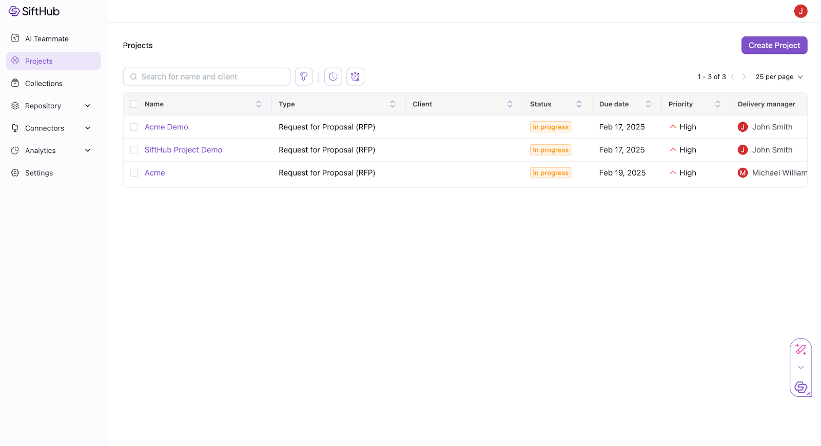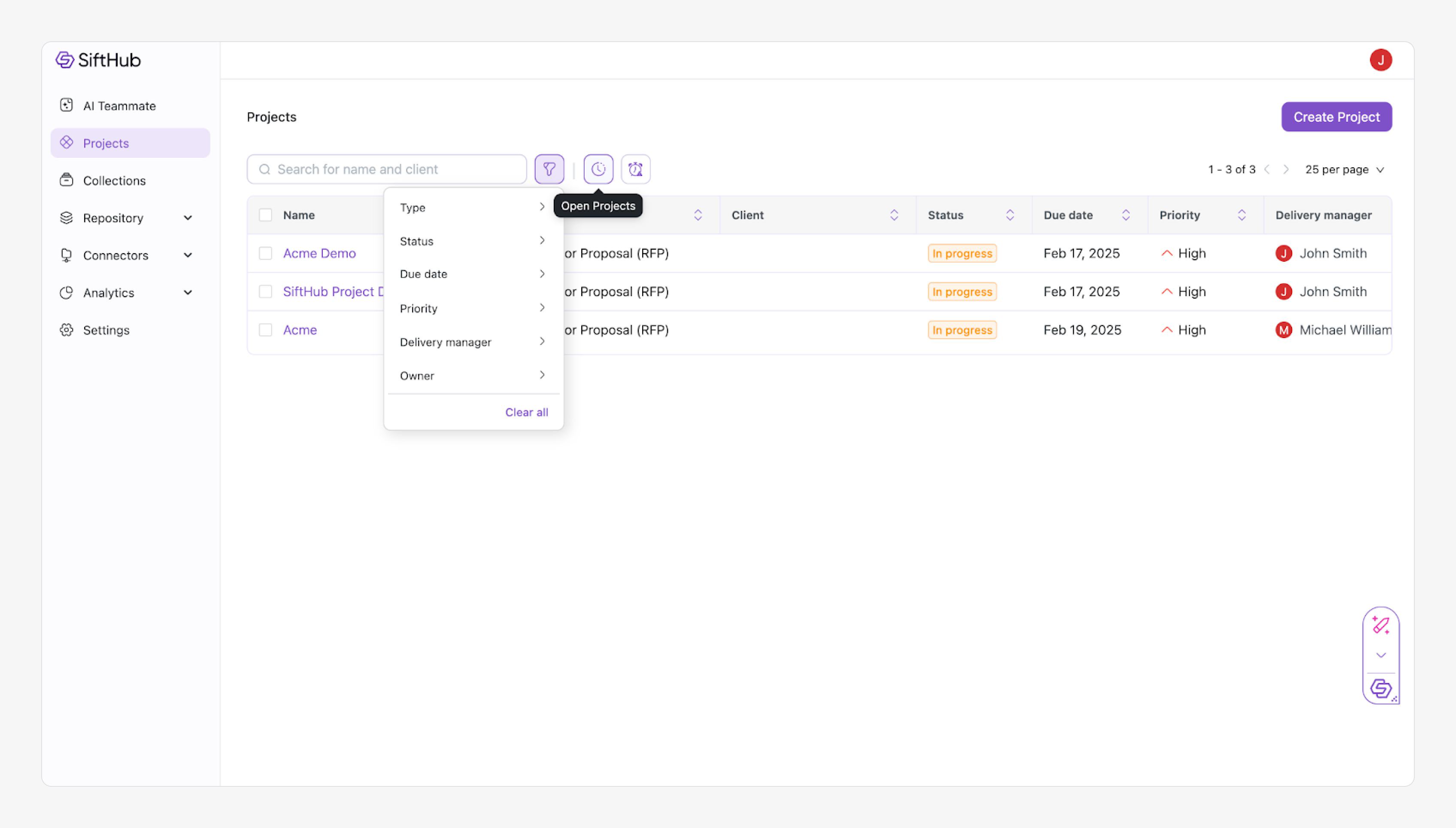 - Use the Search Bar to quickly find a project by name or client.