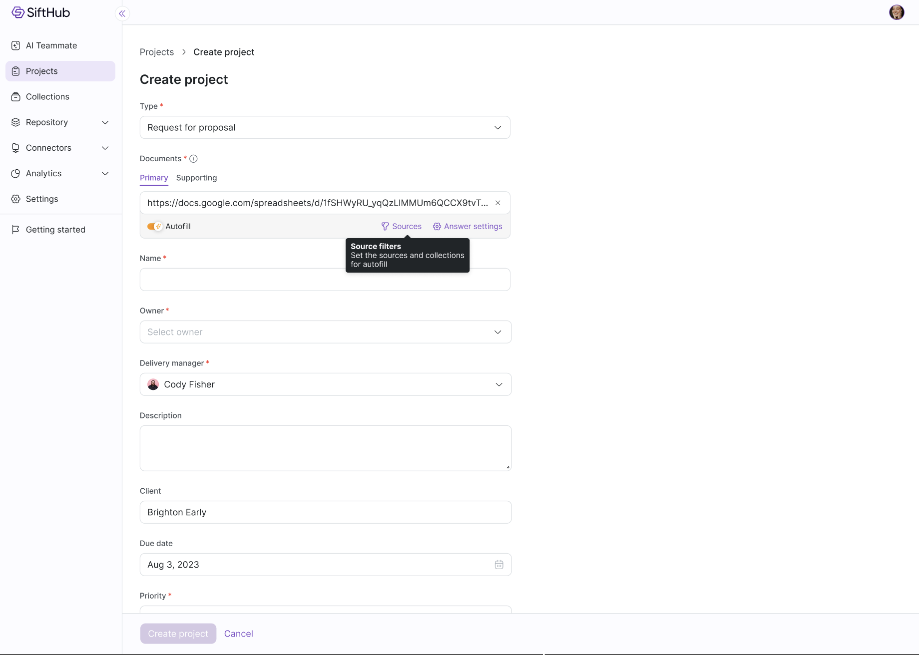 SiftHub allows users to create Projects for spreadsheet-based questionnaires or document-based proposals, enabling automated responses and efficient document management. Whether you're working with security questionnaires, RFPs, or any standardized forms or proposal templates, SiftHub's project creation capabilities help streamline your workflow.