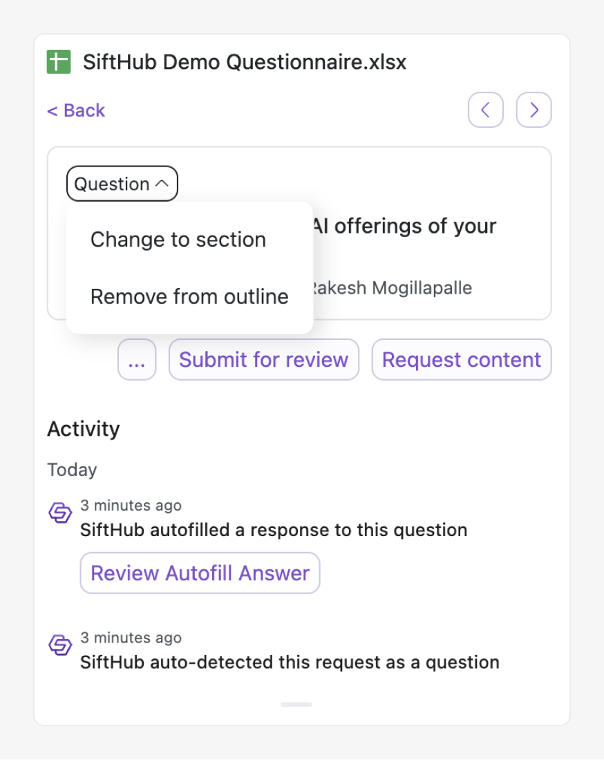 While SiftHub is able to identify most of the sections and questions in the Primary Document and map them to the outline, some of them might be missed in a few rare cases. To handle these cases, SIftHub provides flexible outline modification options such as adding or removing sections and questions or converting between them.