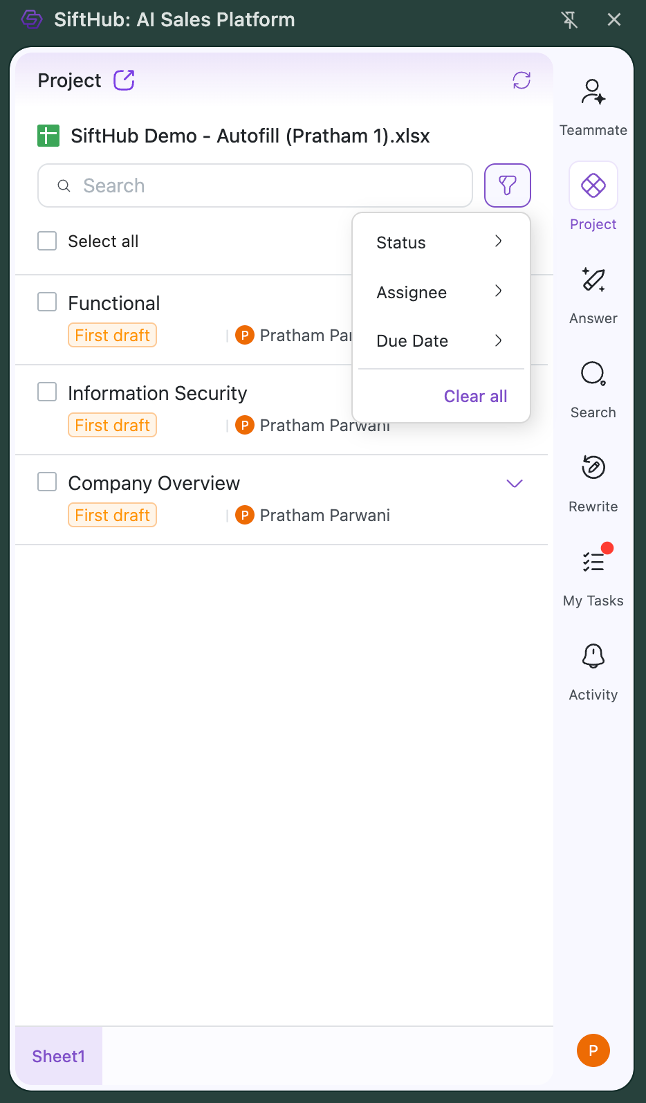 When a user creates a Project in SiftHub, the system automatically analyzes and parses the questionnaire or proposal as the Primary Document to create an intelligent outline in the Projects tab of the Browser Extension / MS Add-in. This transforms your spreadsheet-based questionnaire or document-based proposal into a structured, collaborative workspace by organizing all sections and questions across each tab of your Primary Document into an intuitive hierarchical outline.