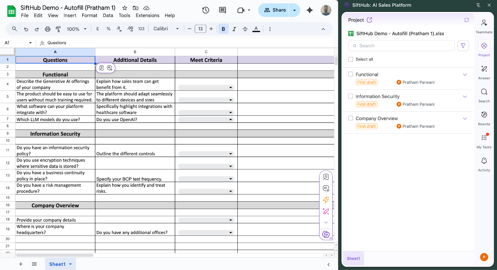 - The Google Sheet will open with the SiftHub Browser Extension automatically launched
