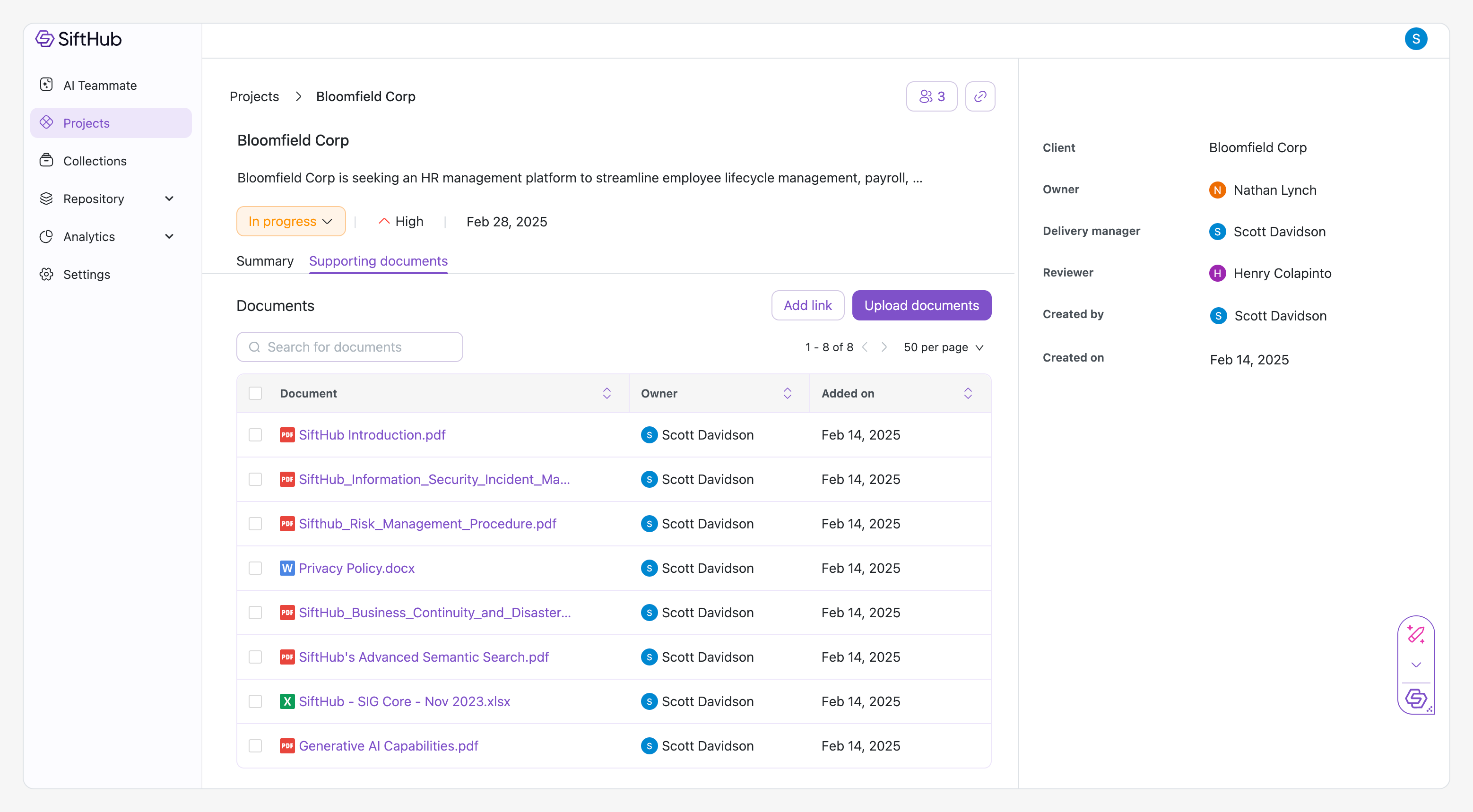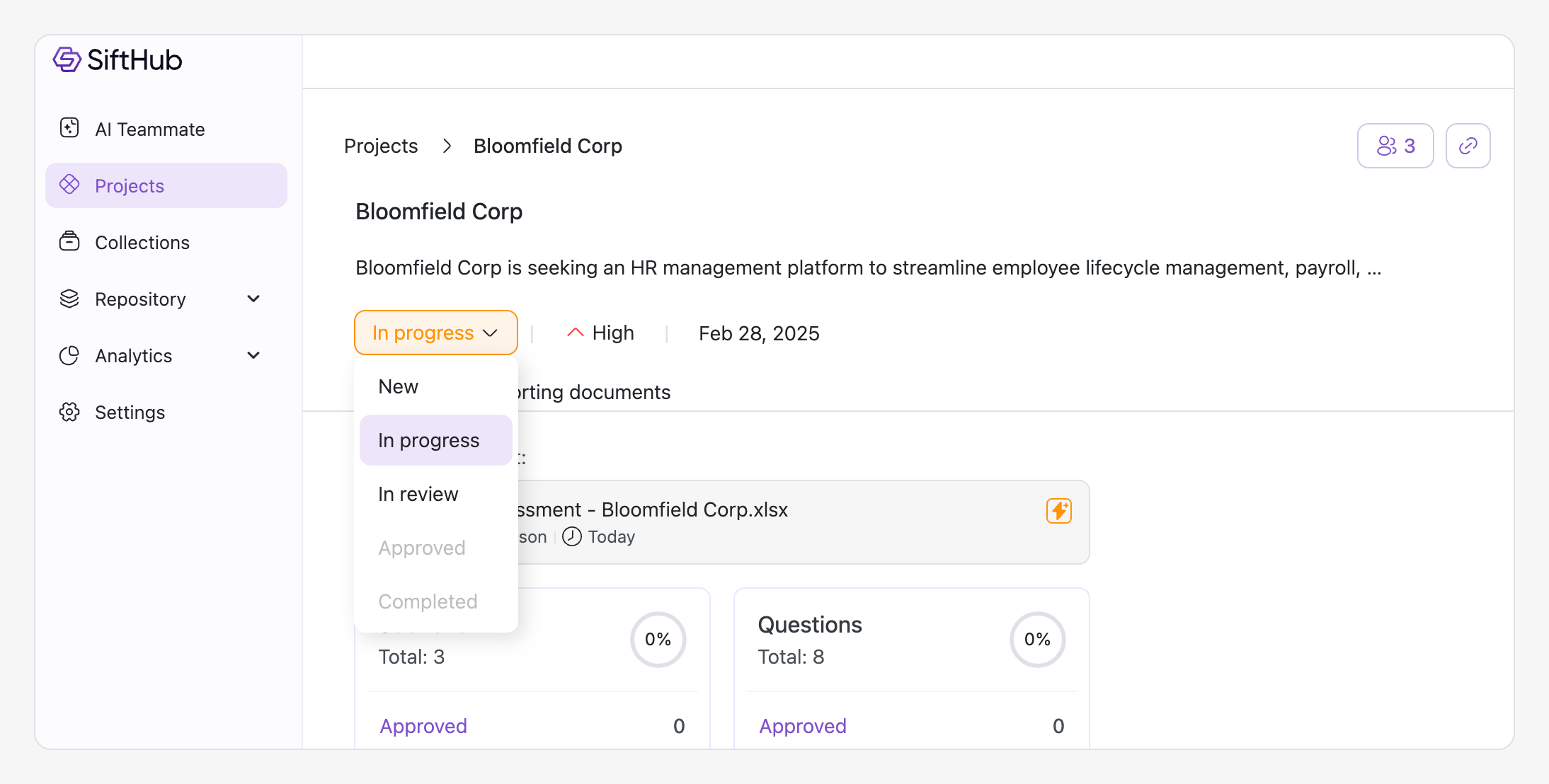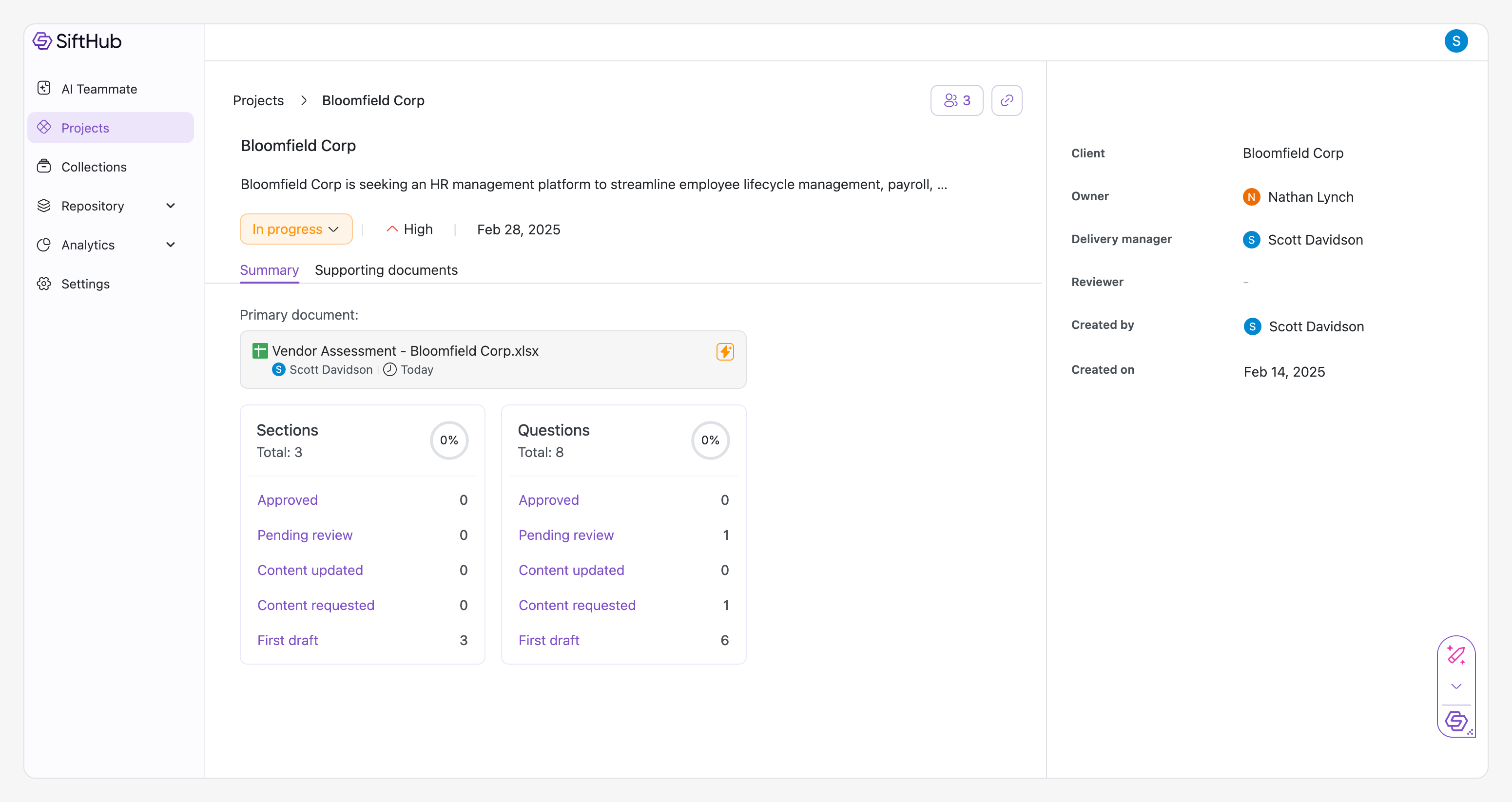 The main view of the details page displays a comprehensive Project summary showing progress across Sections and Questions, helping teams track content development and identify areas needing attention. The summary includes completion percentages, status breakdowns, and helps you view and manage the primary document. For detailed information about tracking progress, see Project Summary.
