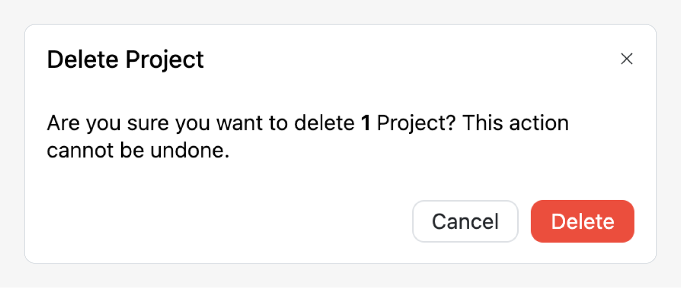 Projects can be deleted using the delete icon in the top-right corner. A confirmation modal will appear to prevent accidental deletions.