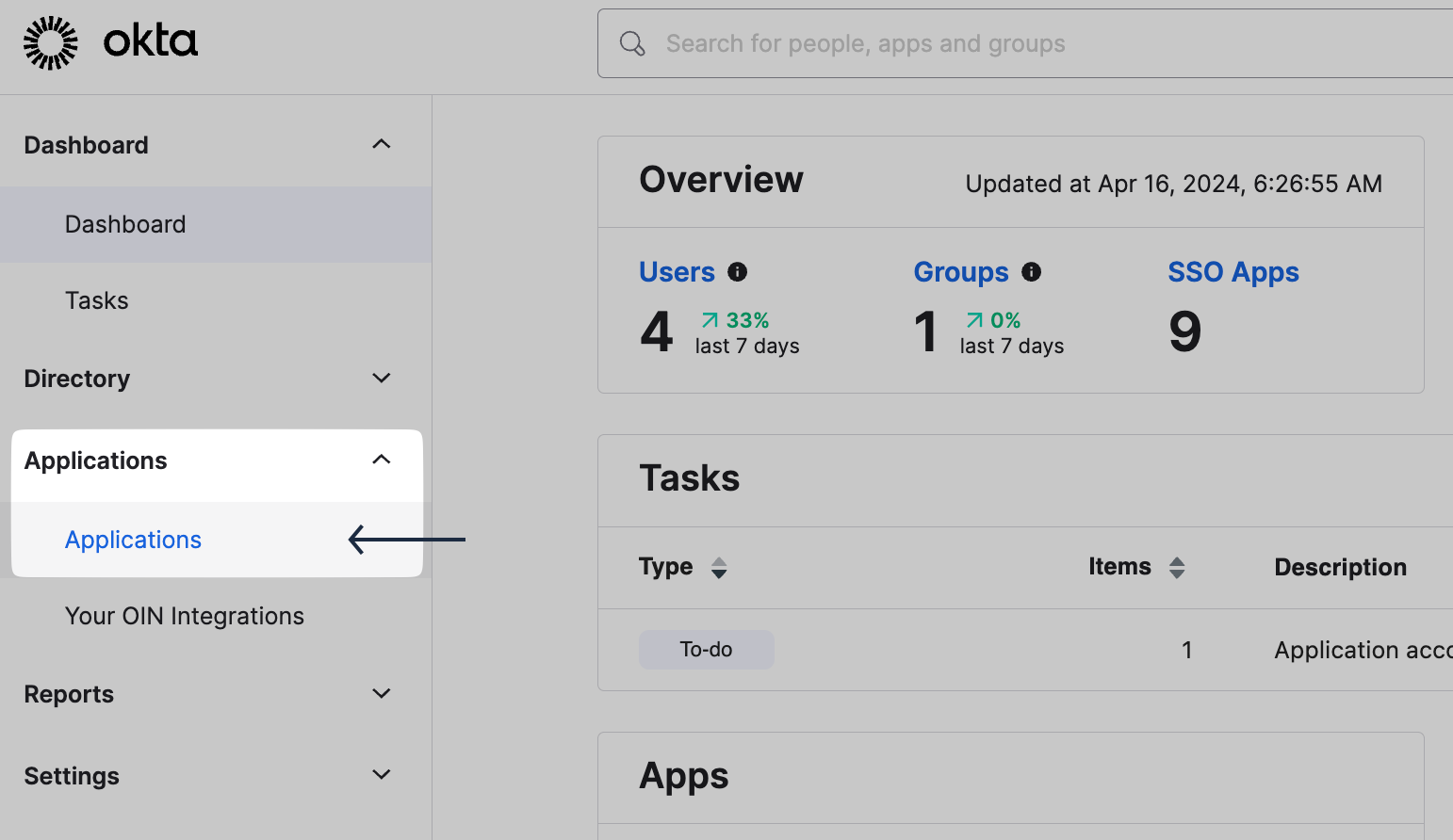 - Go to the Okta admin dashboard and navigate to "Applications" in the main menu.