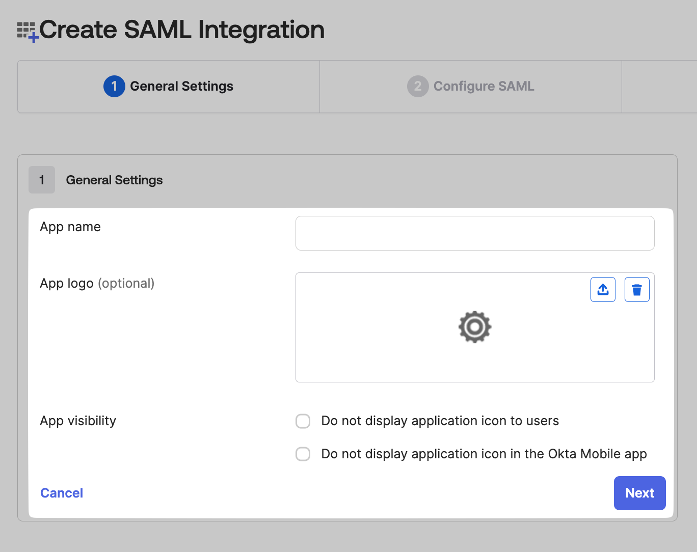 - Once you fill in the General Settings, click “Next” and proceed to Configure SAML.