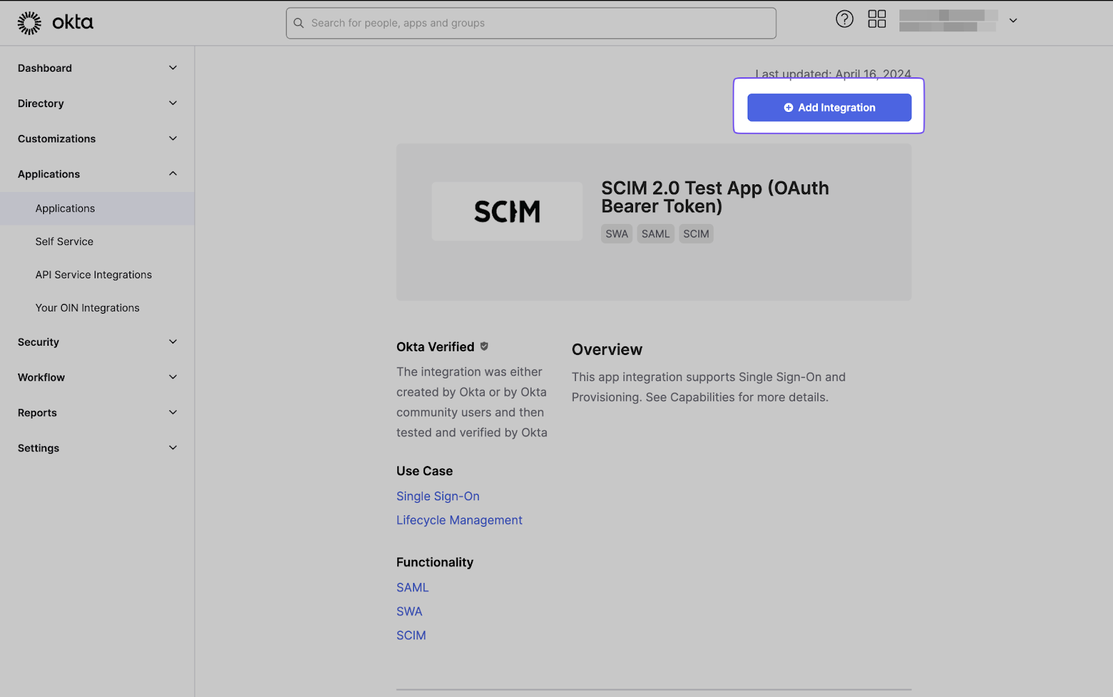 Search for "SCIM 2.0 Test App (OAuth Bearer Token)" and select the corresponding result.