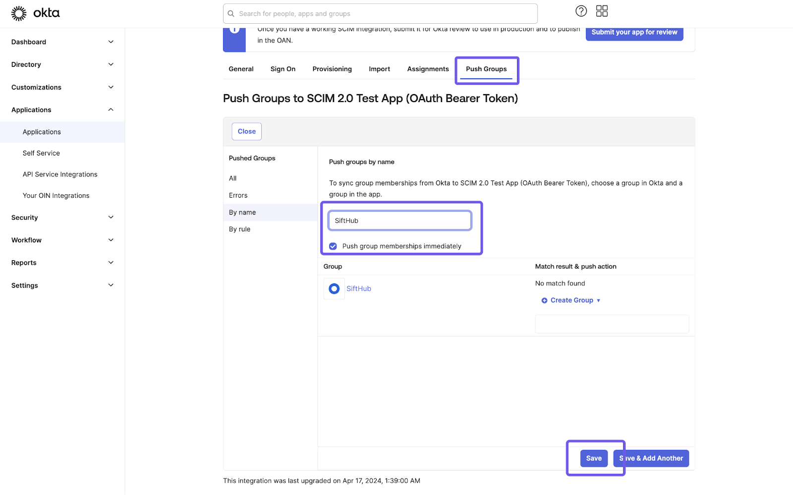 - Assign the SiftHub SAML integration to the ‘SiftHub’ Group in Okta.