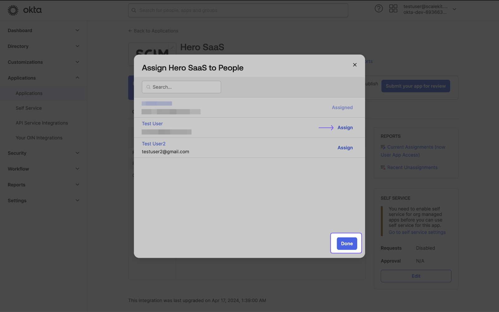 - Assign the SiftHub SAML integration to the ‘SiftHub’ Group in Okta. - If you want to continue assigning to individual users anyway, click “Assign to People” and click “Assign” next to the people you want to assign it to. Ensure that you have assigned the app to yourself to persist your current active session in SiftHub and avoid being locked out of your account. Click on Save and Go Back, and click on Done.