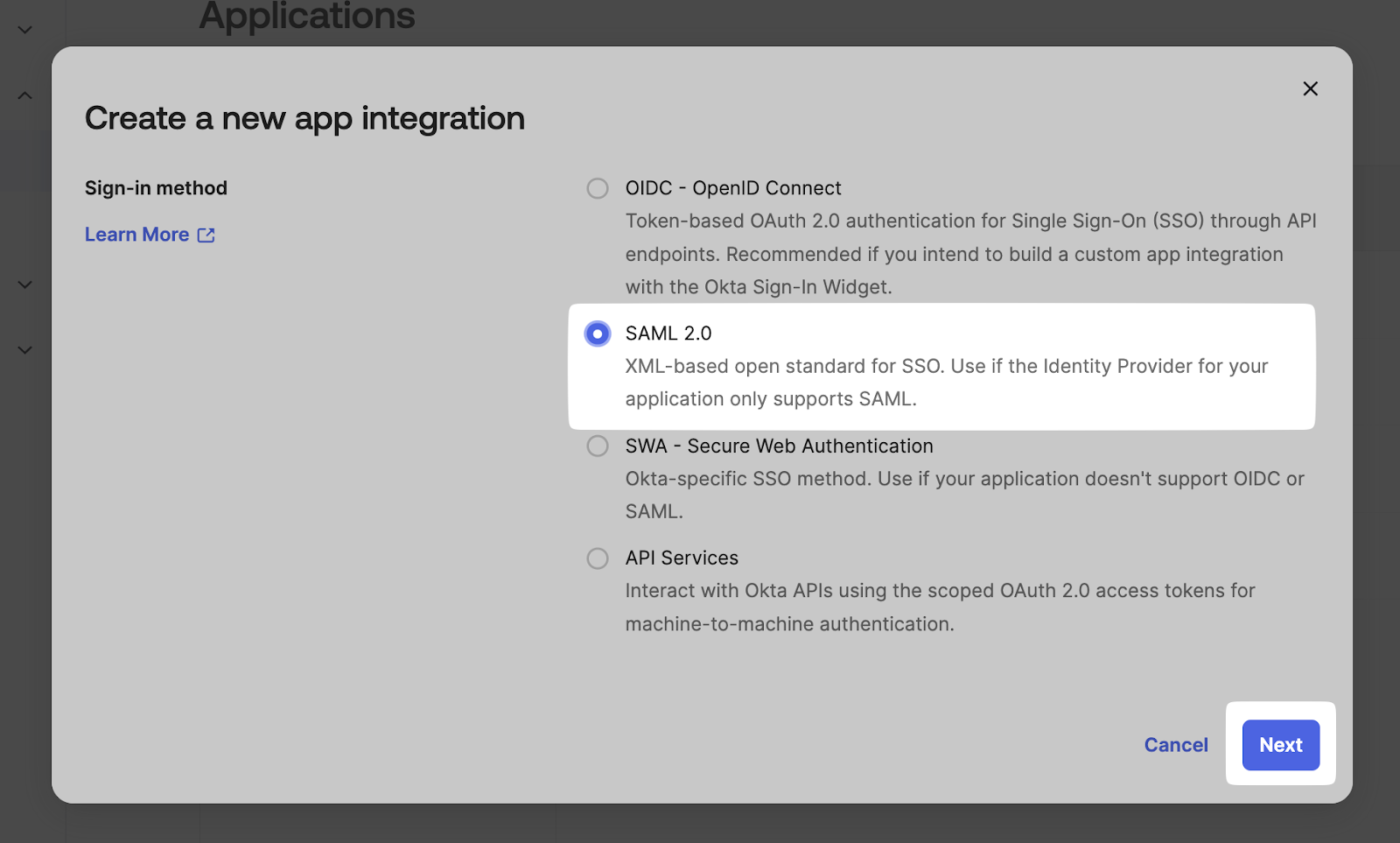 - Select SAML 2.0 as the Sign-in method and Click “Next”.