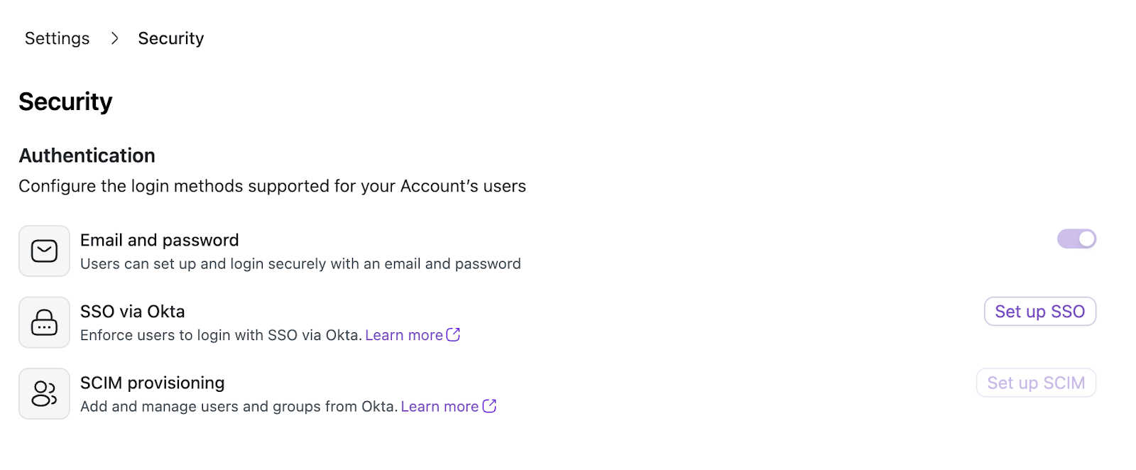 Now log in to an Account Owner or Security Admin profile in SiftHub. Note that SSO setup needs to be completed before you can enable SCIM provisioning. Go to Settings > Security and click “Set up SCIM”.