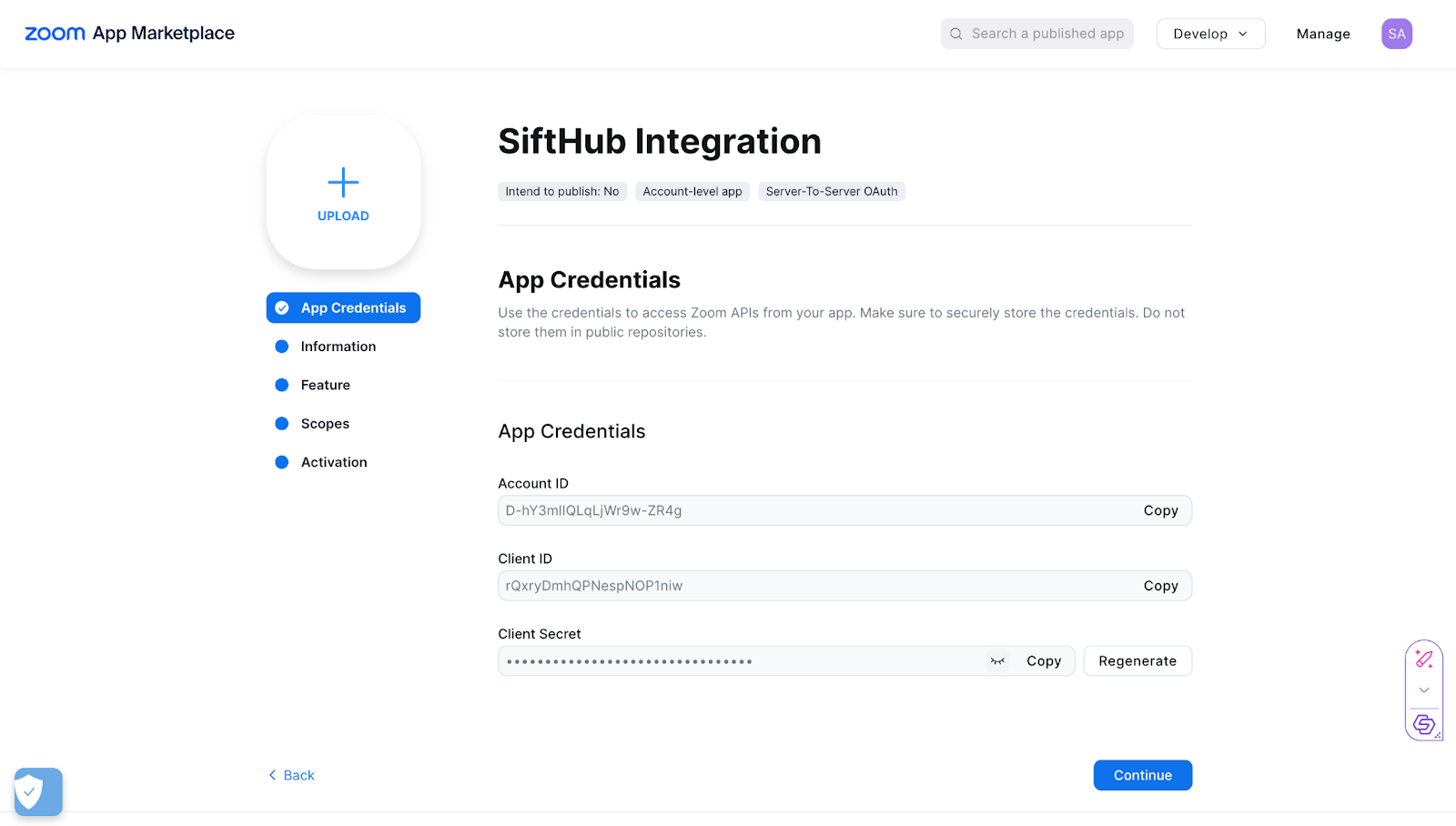 - In App Credentials, copy Account ID, Client ID and Client Secret. Click on Continue.