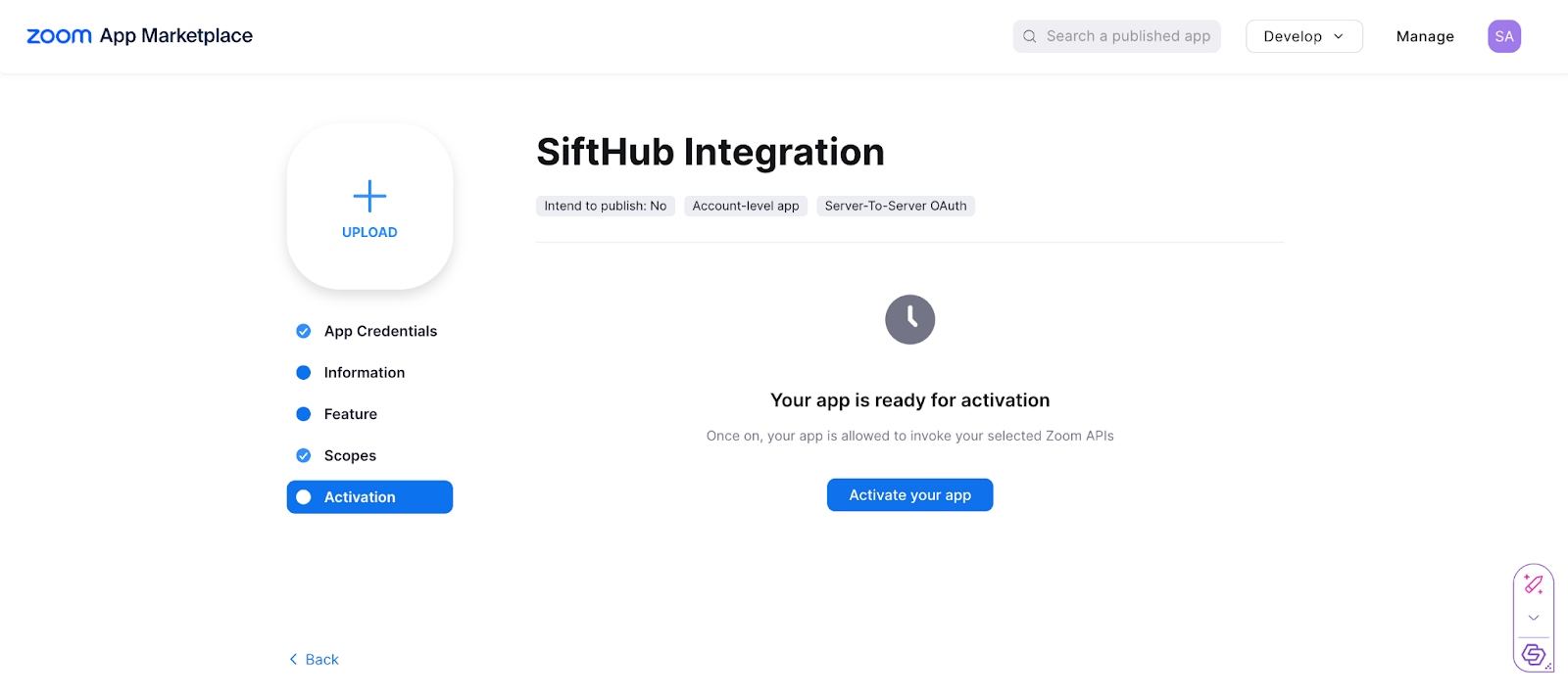 - Finally navigate to the Activation section - click on Activate your app.