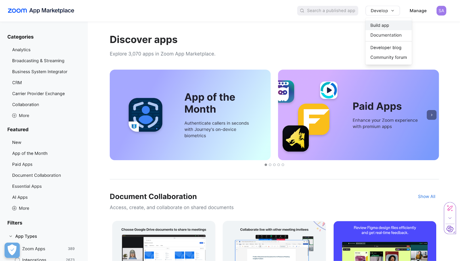 - In the Zoom App Marketplace, navigate to the top left corner: Develop -> Build app.