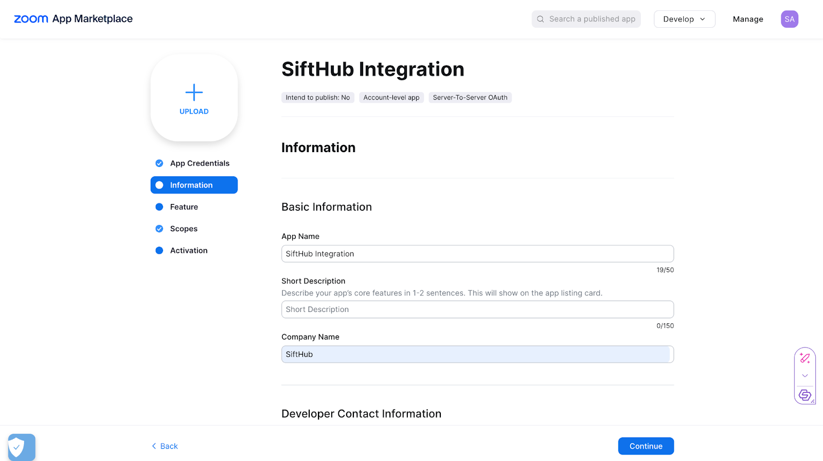 - In the Information section, Add your Basic Information and Developer Contact Information. Click on Continue.
