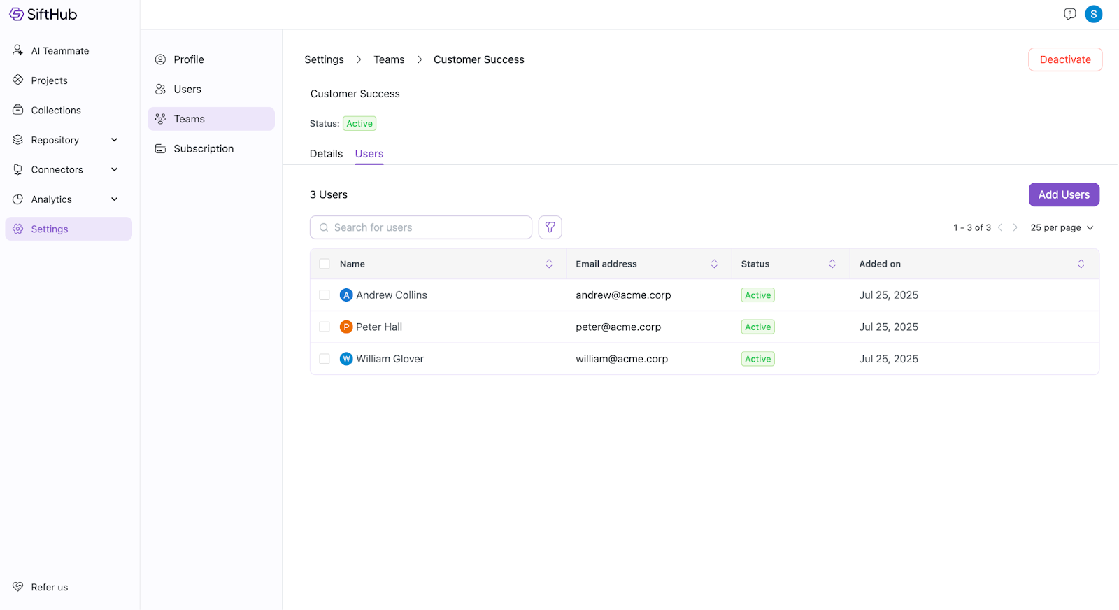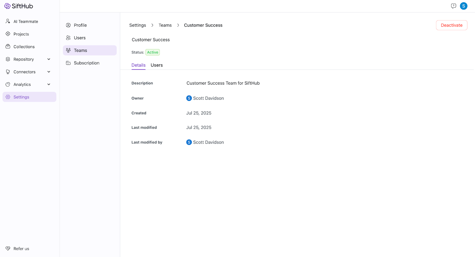 - Click "Deactivate" to confirm. This action will change the team's status to "Inactive".
