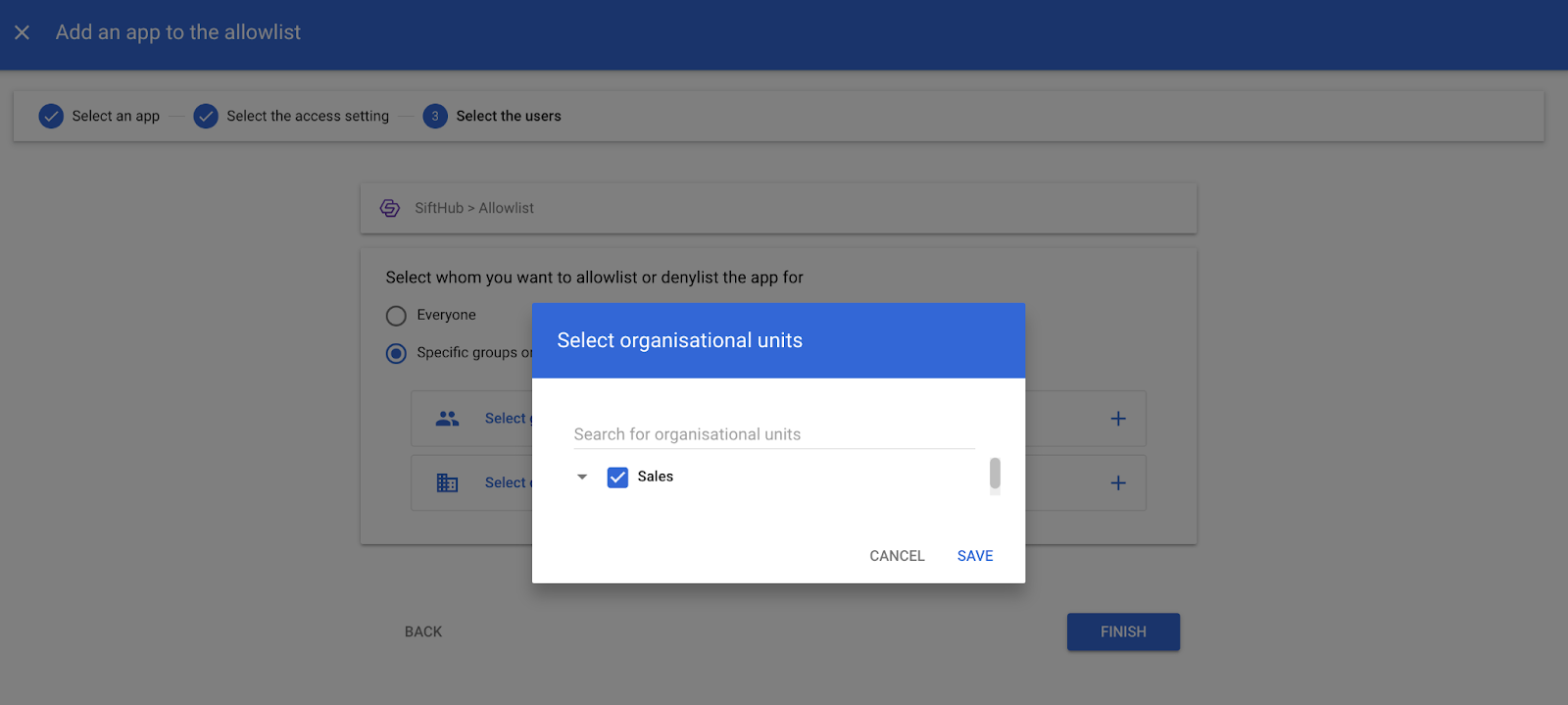 Select the users (To only allow installation for an organizational unit or group, select the organization unit/group and the app is excluded for all other users) and click SAVE and FINISH.