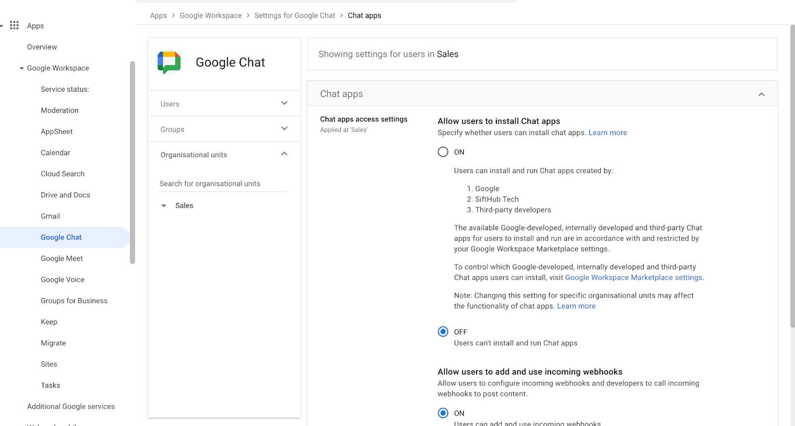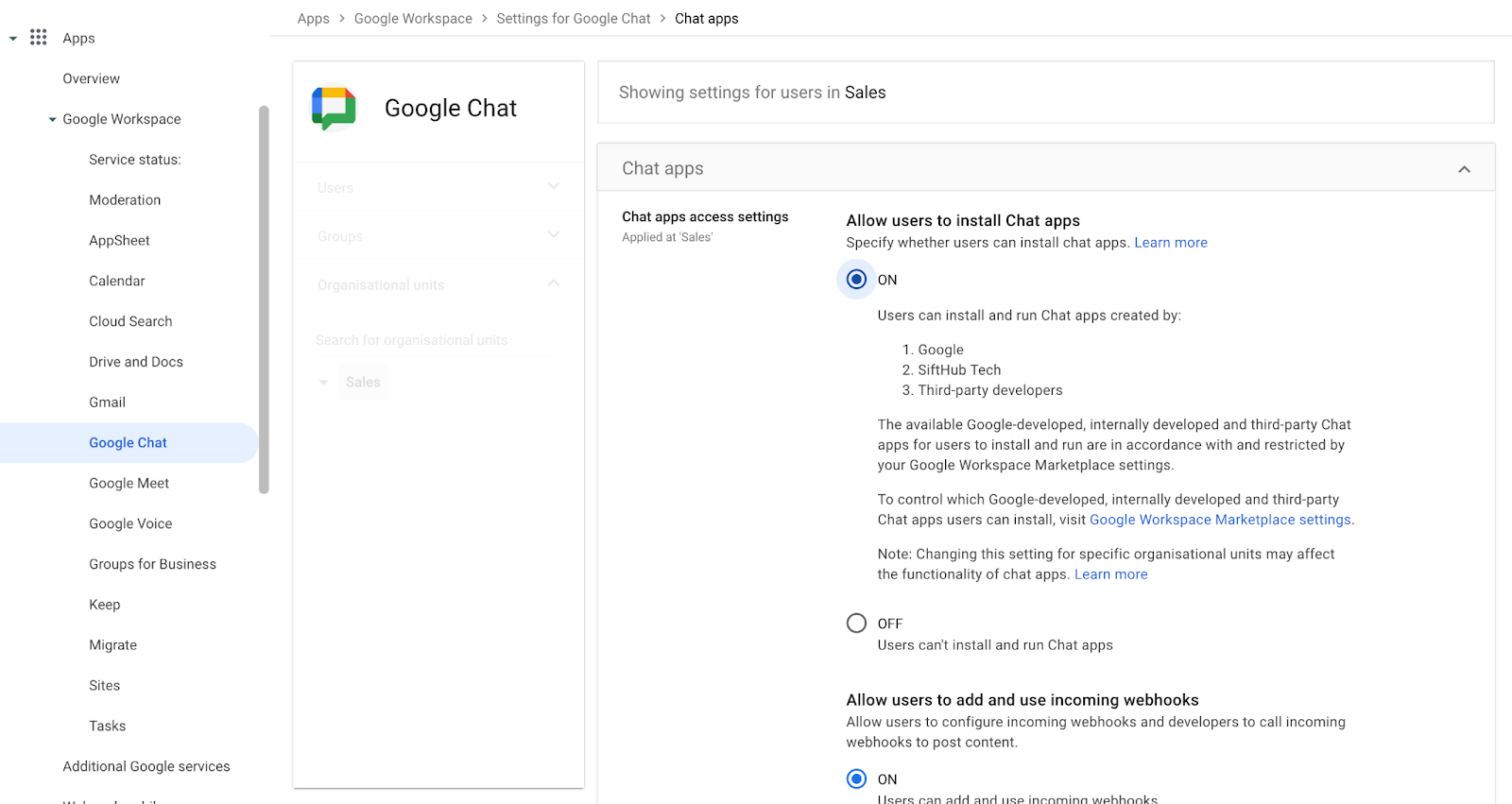 - Under Allow users to install Chat apps, select On and click SAVE.