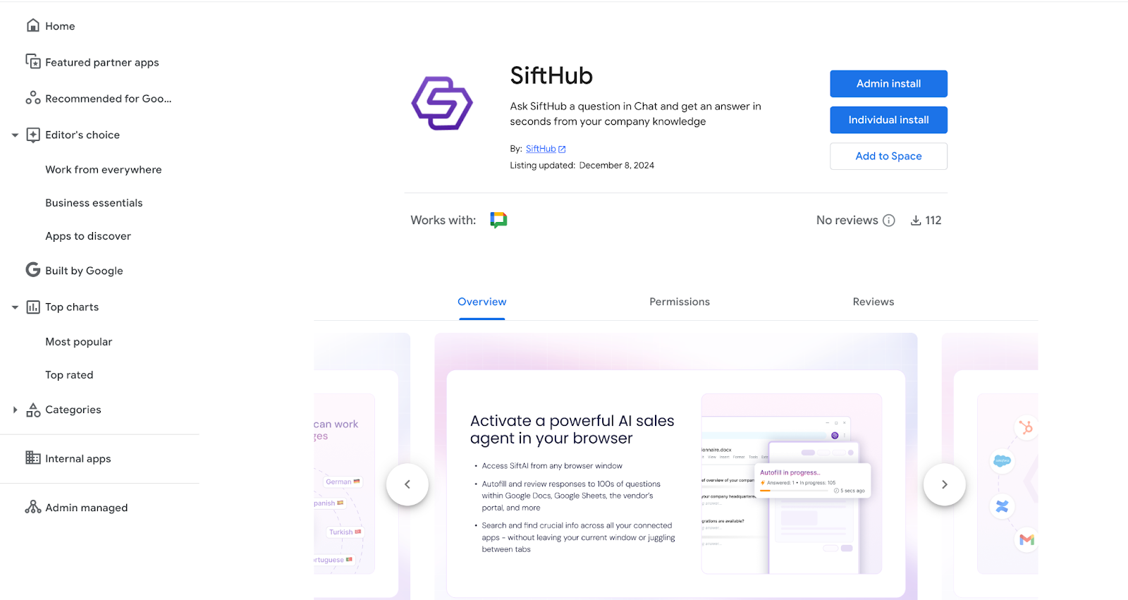 You can install the SiftHub app using one of the following methods. Click Google Workspace Marketplace to visit the SiftHub app listing, where you will see multiple options for Admin install, Individual install, and Add to Space.