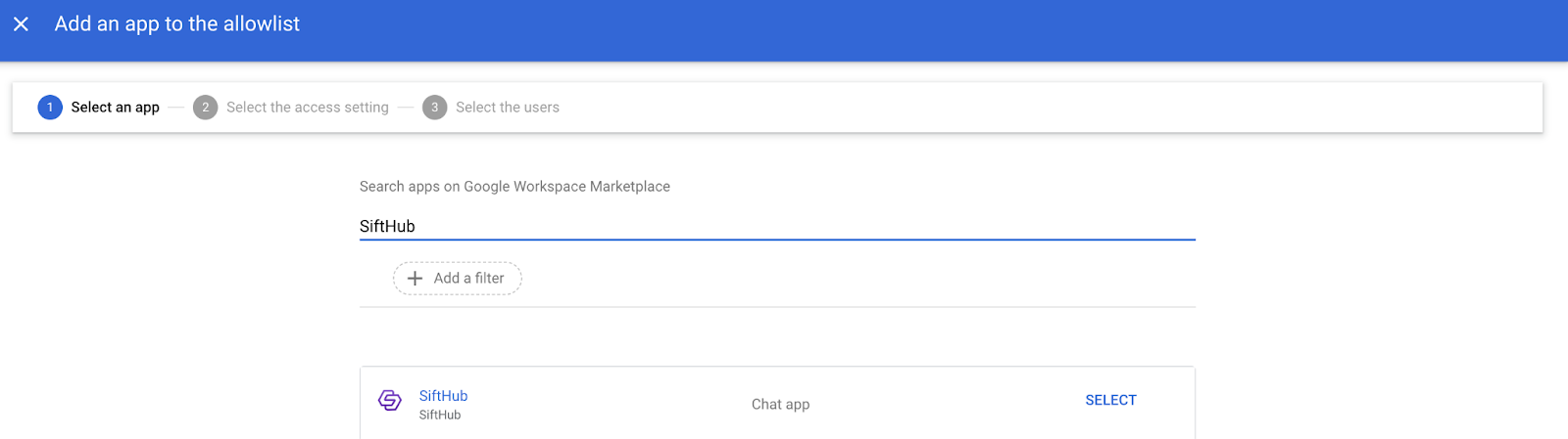- Search for SiftHub and next to the app, click SELECT.