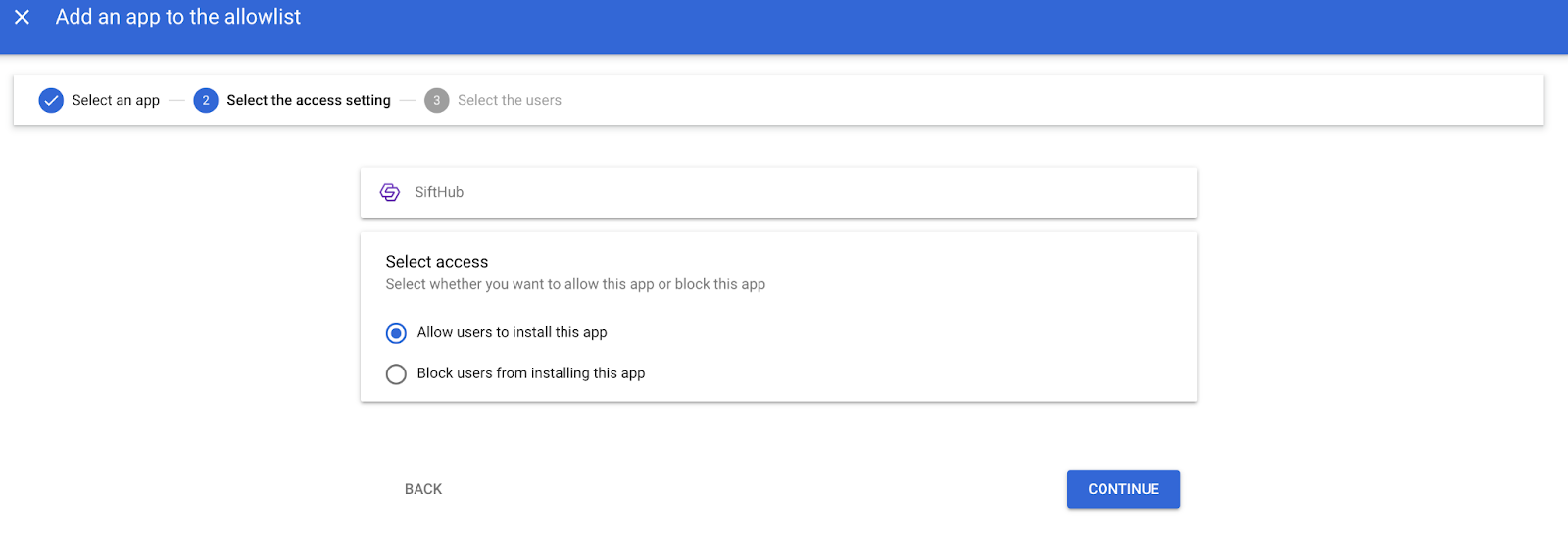 - Under Select access, Allow users to install this app and click CONTINUE.